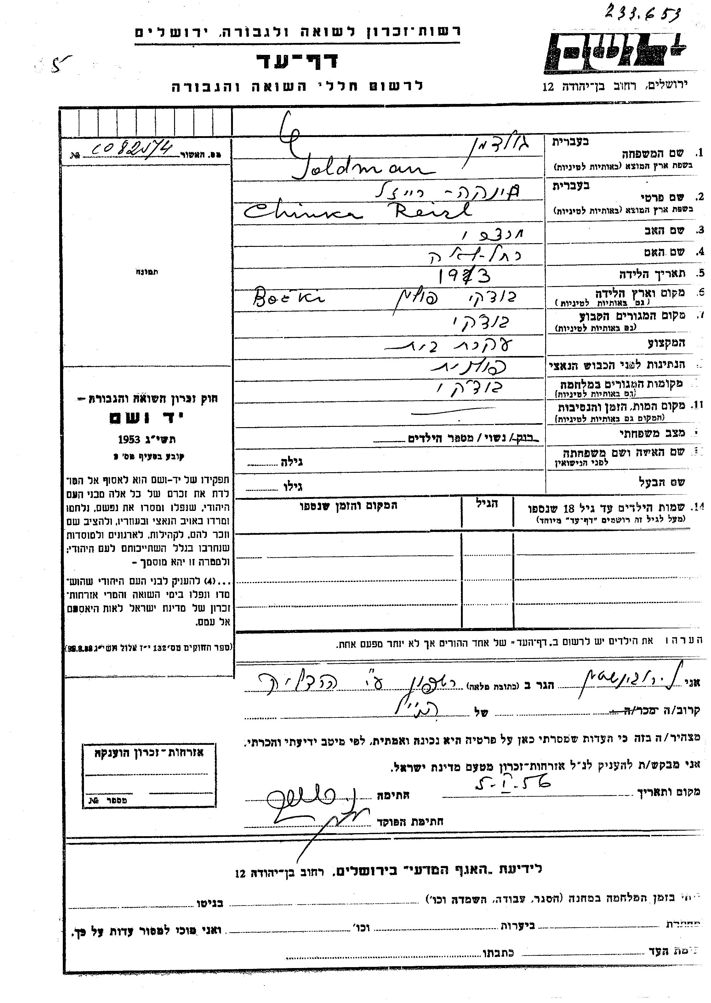 Chinka Reisl Goldman wurde im Jahr 1913 in Bocki, Polen geboren. Sie war die Tochter von Mordekhai und Rakhel Lea. Sie war Hausfrau und Ledig. Vor dem Zweiten Weltkrieg lebte sie in Bocki, Polen. Während des Krieges war sie in Bocki, Polen.