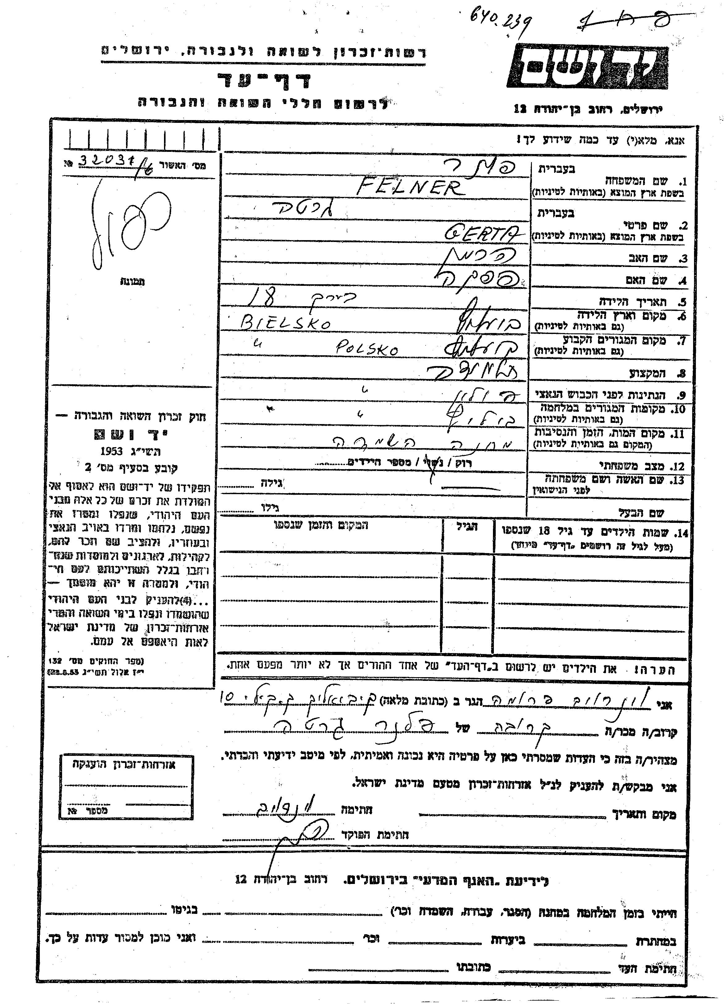 Greta Felner wurde in Bielsko, Polen geboren. Sie war die Tochter von Herman und Pepka. Sie war Schüler/-in und Ledig. Vor dem Zweiten Weltkrieg lebte sie in Bielsko, Polen. Während des Krieges war sie in Bielsko, Polen.