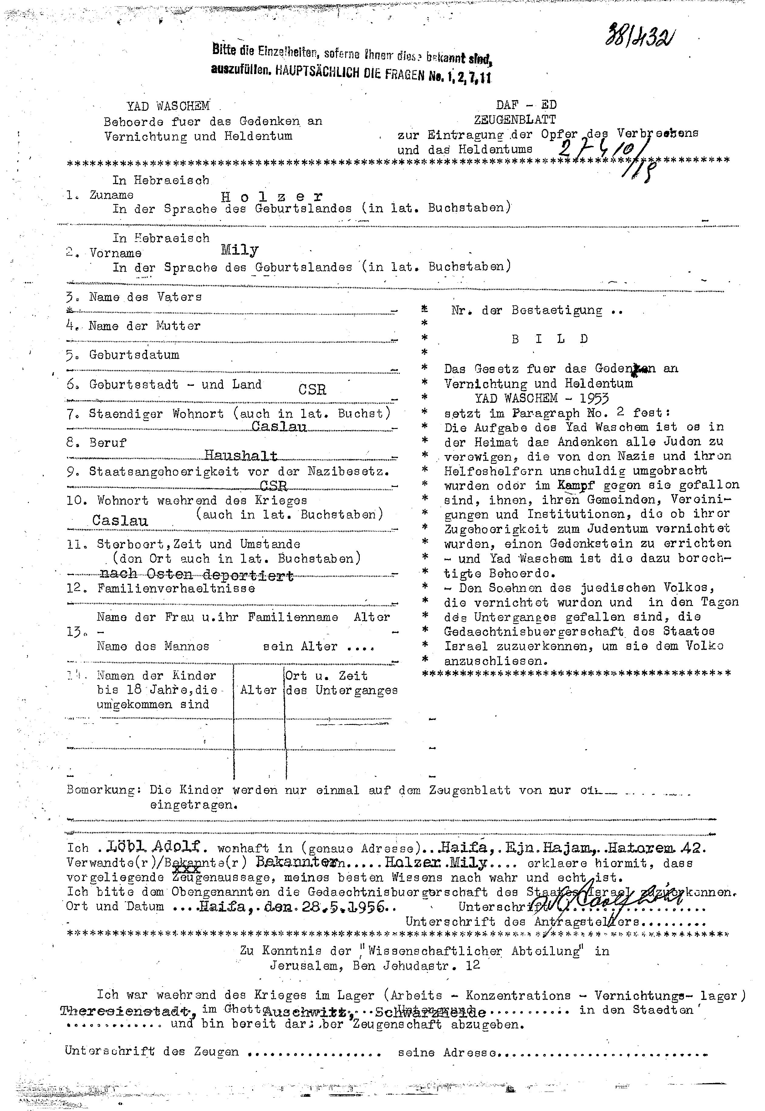 Mili Holzer wurde in Tschechoslowakei geboren. Sie war Hausfrau. Vor dem Zweiten Weltkrieg lebte sie in Caslau, Tschechoslowakei. Während des Krieges war sie in Caslau, Tschechoslowakei.