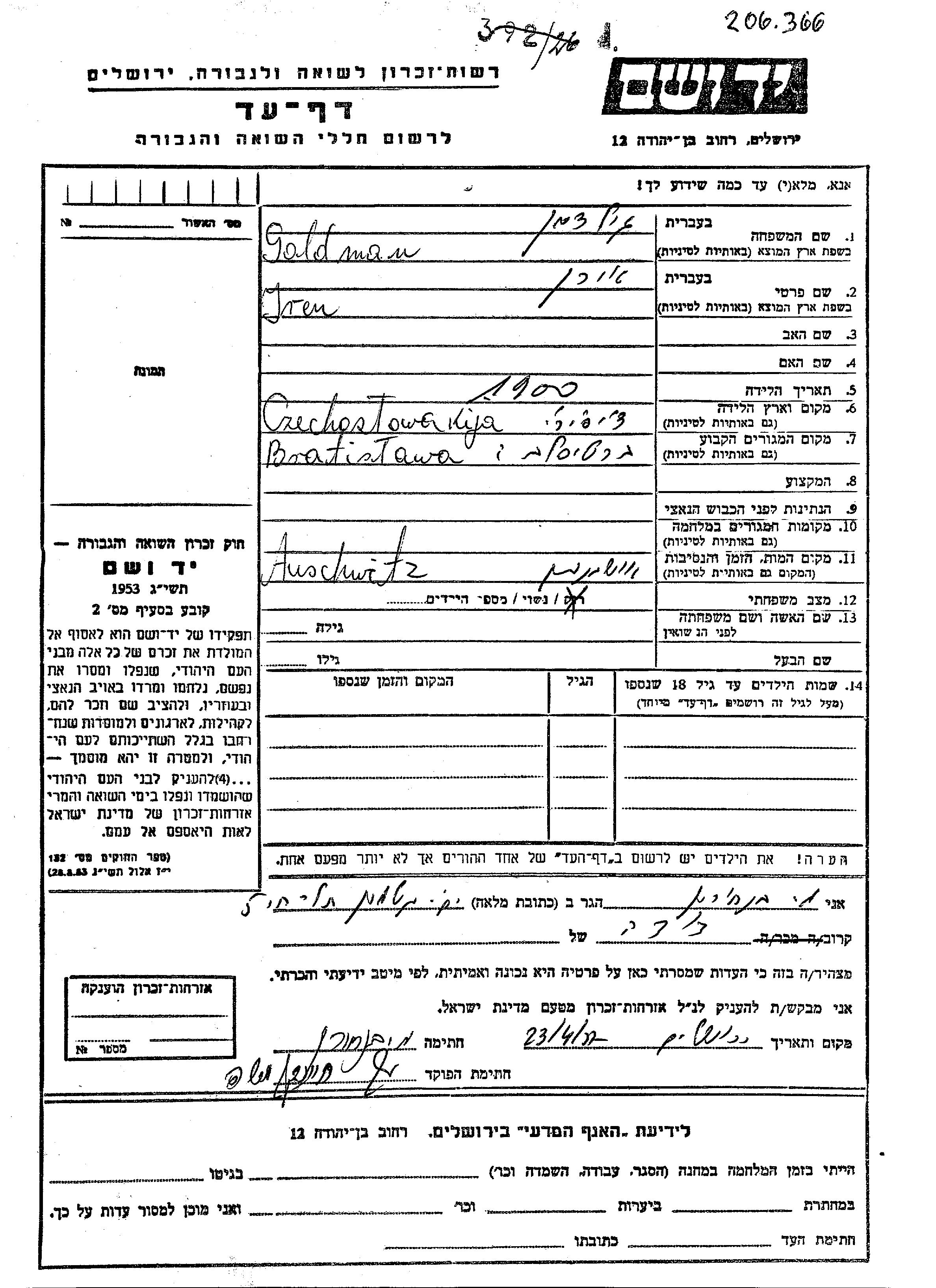 Iren Goldman wurde im Jahr 1900 in Tschechoslowakei geboren. Sie war Verheiratet. Vor dem Zweiten Weltkrieg lebte sie in Bratislava, Tschechoslowakei.