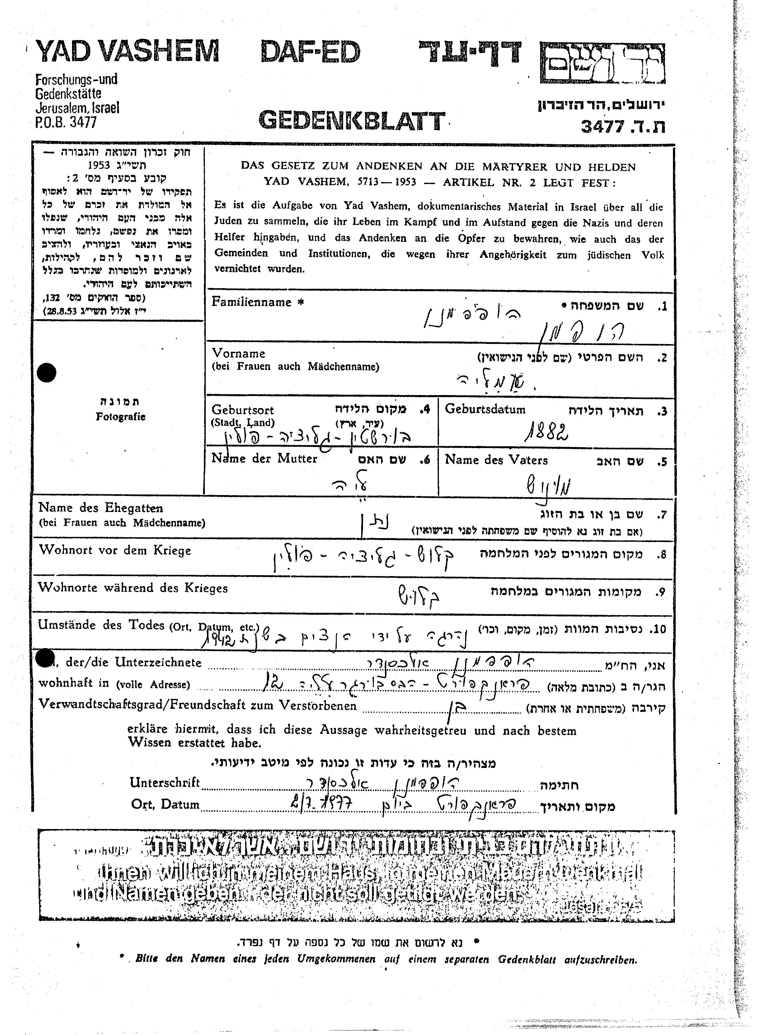 Amalia Hofman wurde im Jahr 1882 in Bursztyn, Polen geboren. Sie war die Tochter von Munish und Liya. Sie war mit Natan Verheiratet. Vor dem Zweiten Weltkrieg lebte sie in Kalush, Polen. Während des Krieges war sie in Kalush, Polen.