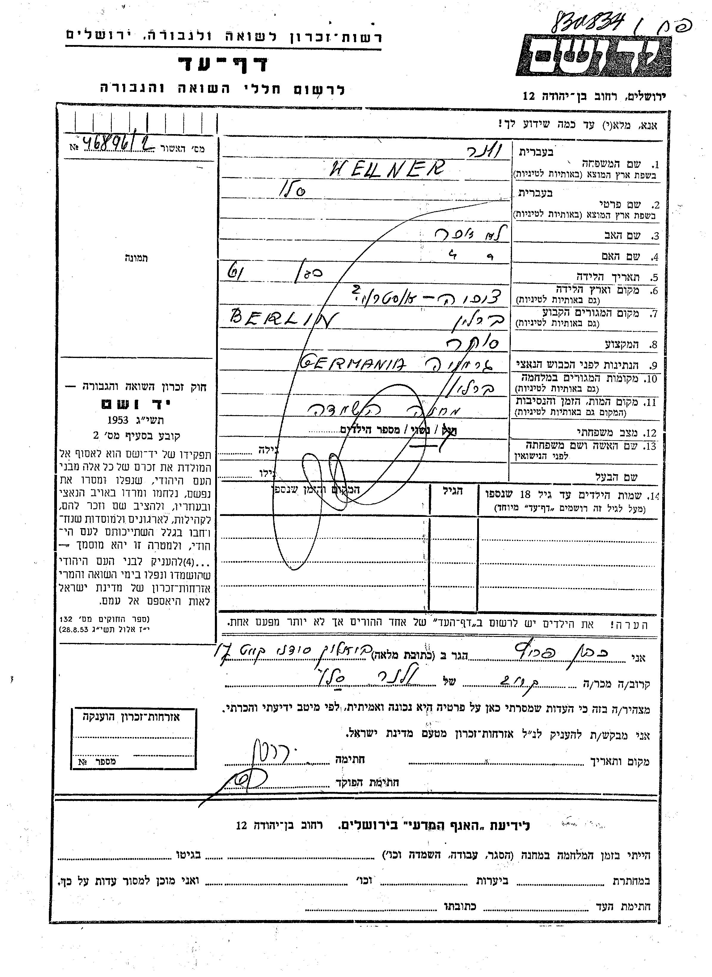 Salo Wellner wurde in Tschechoslowakei geboren. Er war Kaufmann/-frau und Verheiratet. Vor dem Zweiten Weltkrieg lebte er in Berlin, Deutsches Reich. Während des Krieges war er in Berlin, Deutsches Reich.