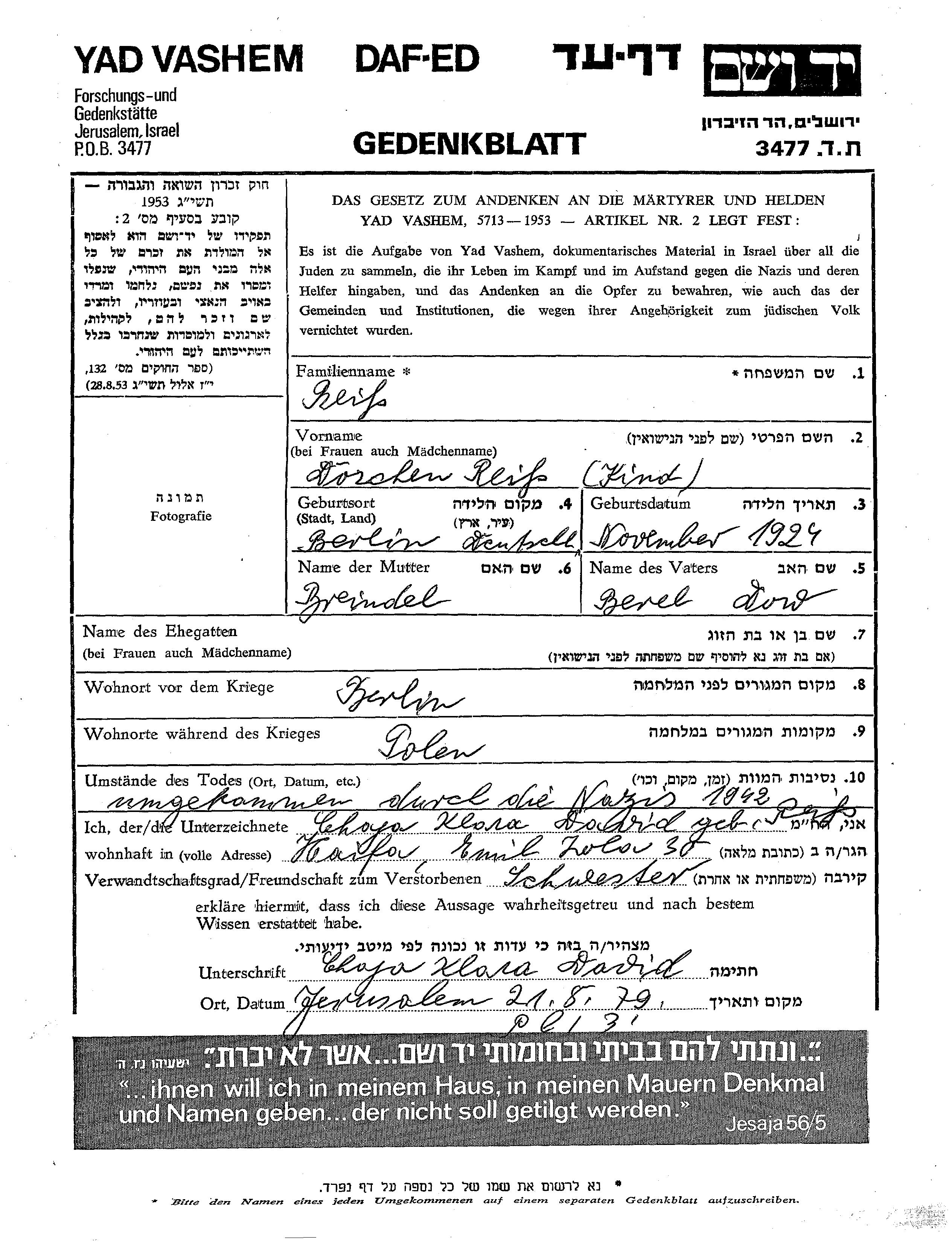 Dorchen Reip wurde im Jahr 1924 in Berlin, Deutsches Reich geboren. Sie war die Tochter von Berl Dow und Braindel. Sie war Verheiratet. Vor dem Zweiten Weltkrieg lebte sie in Berlin, Deutsches Reich. Während des Krieges war sie in Polen.
