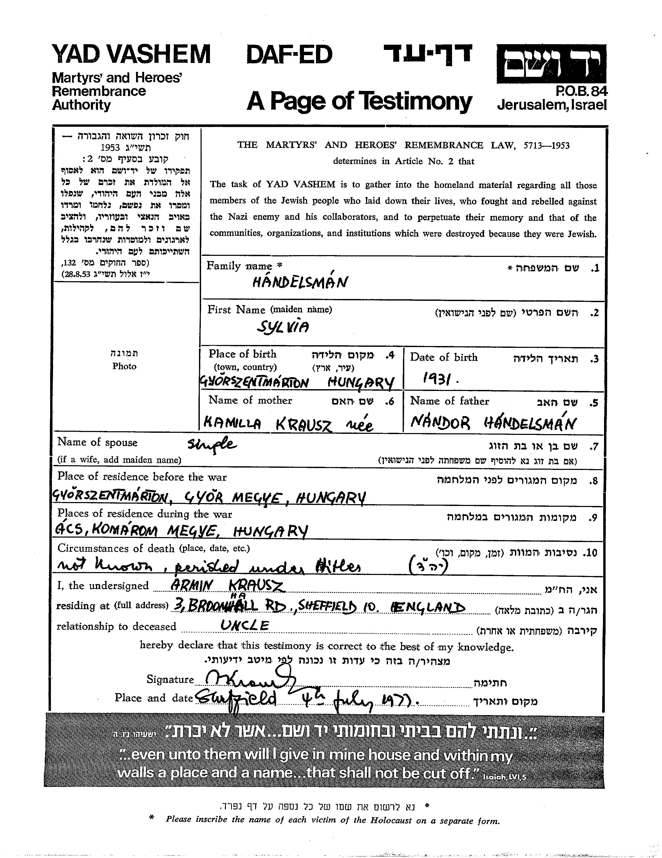Sylvia Handelsman wurde im Jahr 1931 in Gyorszentmarton, Ungarn geboren. Sie war die Tochter von Nandor und Kamilla. Sie war Ledig. Vor dem Zweiten Weltkrieg lebte sie in Gyorszentmarton, Ungarn. Während des Krieges war sie in Komarom, Ungarn.