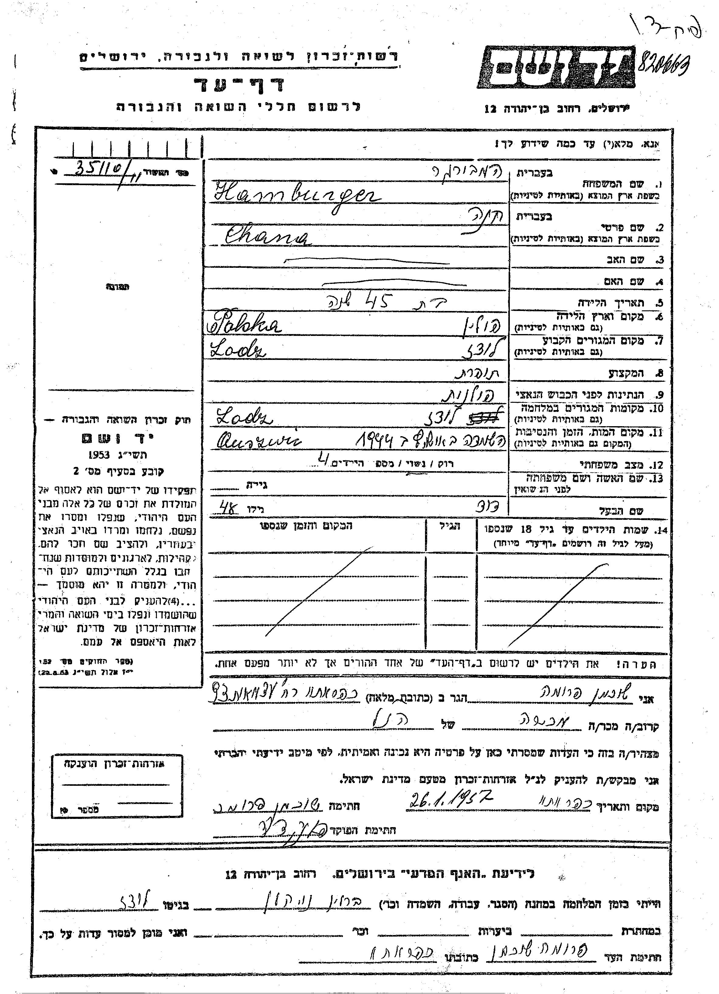 Chana Hamburger wurde in Polen geboren. Sie war Schneiderin und mit David Verheiratet. Vor dem Zweiten Weltkrieg lebte sie in Lodz, Polen. Während des Krieges war sie in Lodz, Polen.