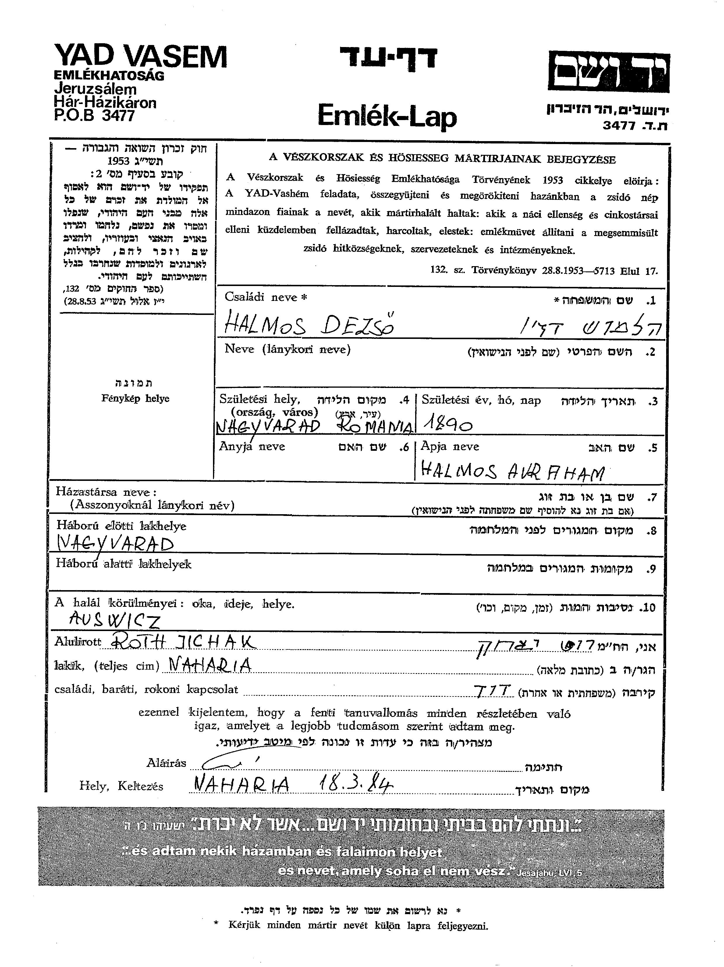 Dezso Halmos wurde im Jahr 1890 in Nagyvarad, Rumänien geboren. Er war der Sohn von Avraham. Vor dem Zweiten Weltkrieg lebte er in Nagyvarad, Rumänien.
