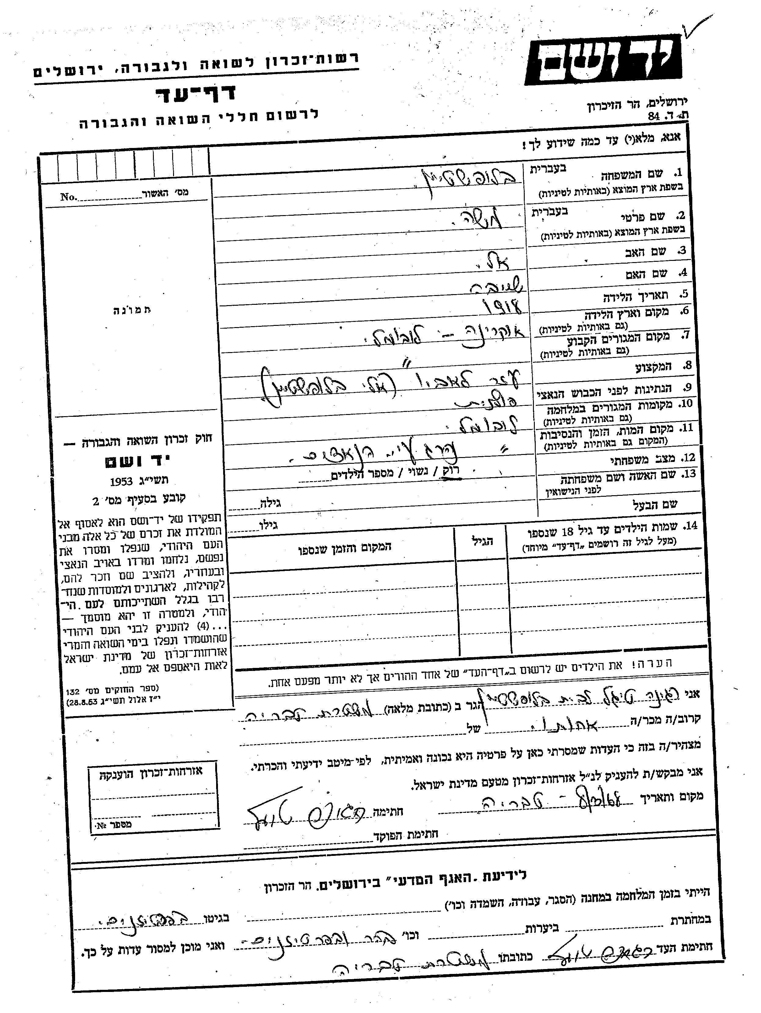 Moshe Blofshtein wurde im Jahr 1918 in Luboml, Polen geboren. Er war der Sohn von Eli und Sheiva. Er war Ledig. Vor dem Zweiten Weltkrieg lebte er in Luboml, Polen. Während des Krieges war er in Luboml, Polen.