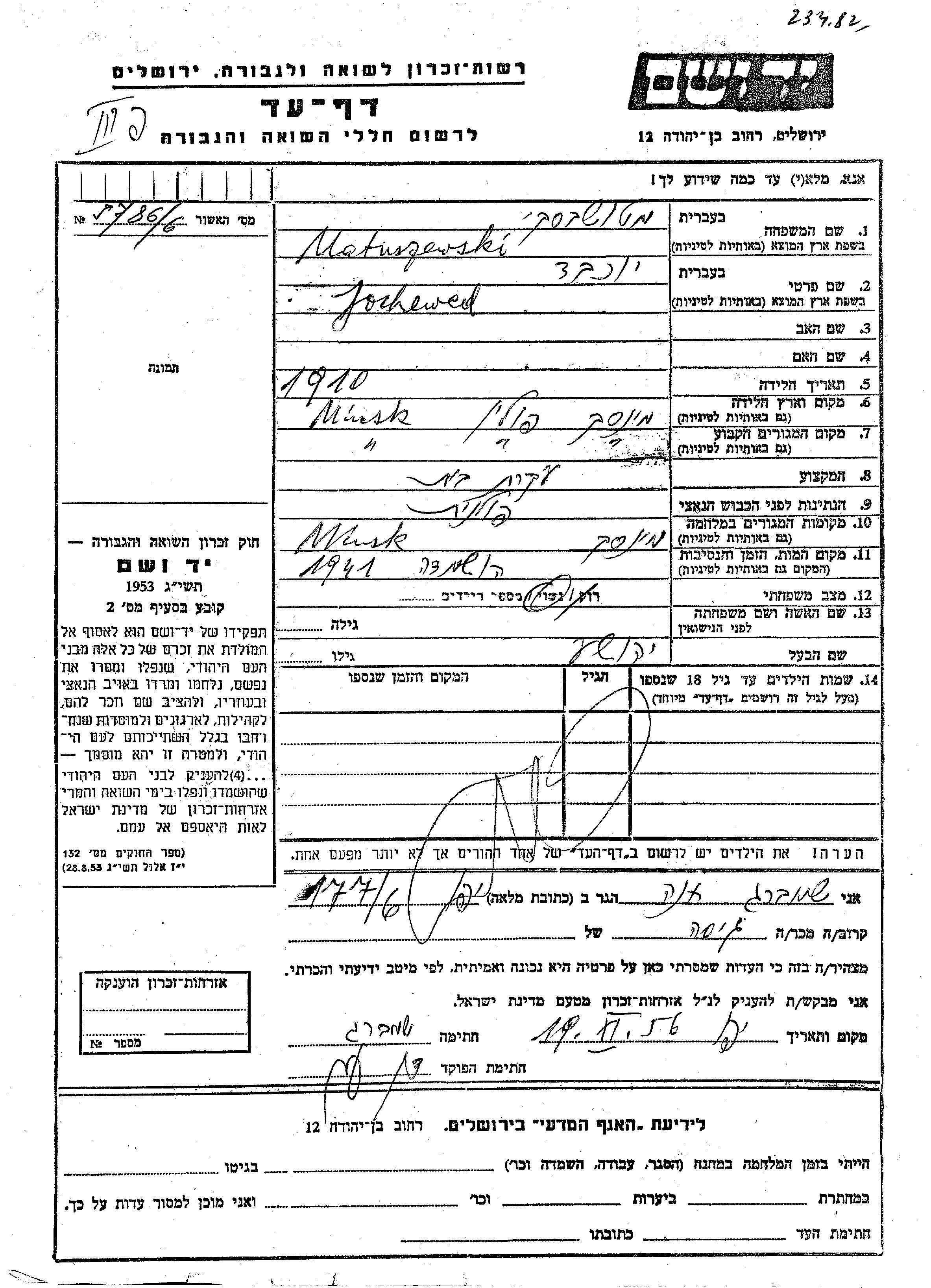 Jochewed Matuszewski wurde im Jahr 1910 in Minsk Mazowiecki, Polen geboren. Sie war Hausfrau und mit Yehoshua Verheiratet. Vor dem Zweiten Weltkrieg lebte sie in Minsk Mazowiecki, Polen. Während des Krieges war sie in Minsk Mazowiecki, Polen.