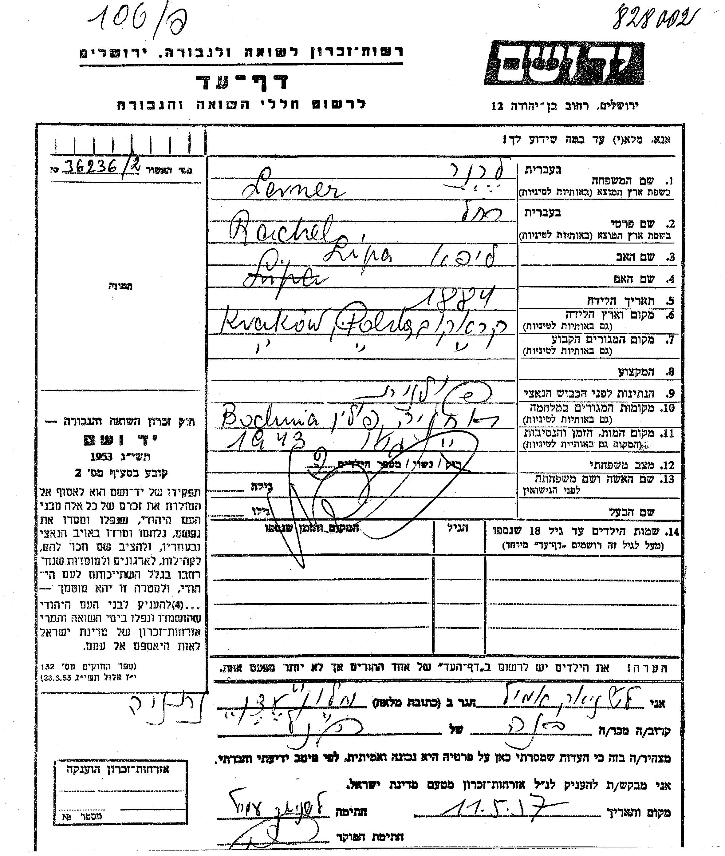 Rachel Lerner wurde im Jahr 1884 in Krakow, Polen geboren. Sie war die Tochter von Lipa. Sie war Verheiratet. Vor dem Zweiten Weltkrieg lebte sie in Krakow, Polen. Während des Krieges war sie in Bochnia, Polen.