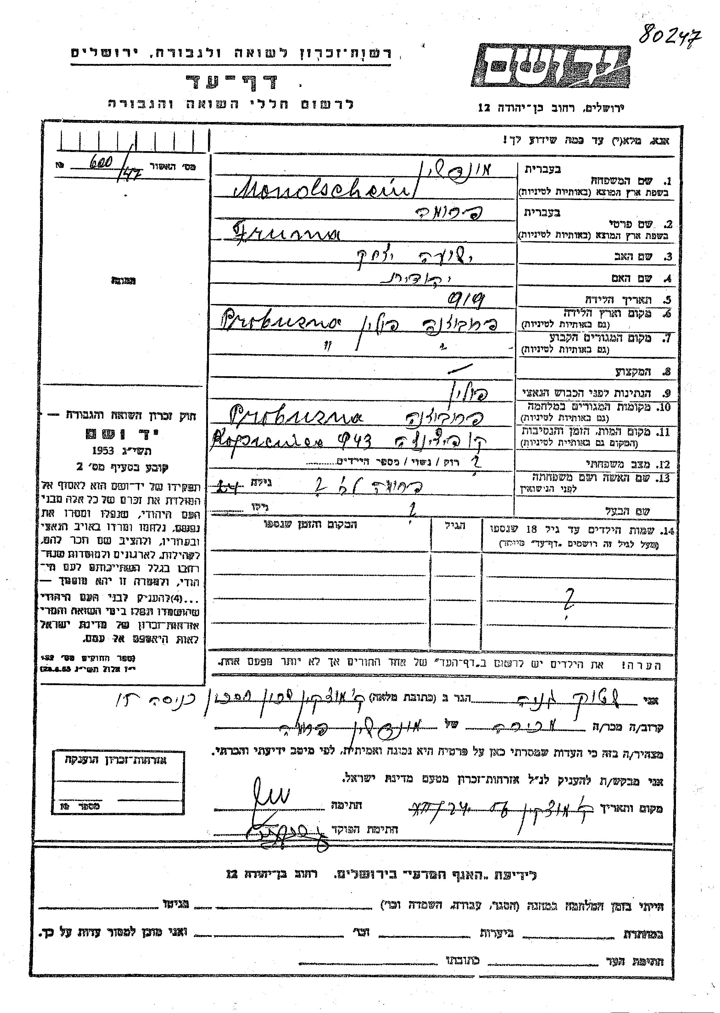 Fruma Mondschein wurde im Jahr 1919 in Probuzna, Polen geboren. Sie war die Tochter von Shiye Yitzkhak und Yehudit. Vor dem Zweiten Weltkrieg lebte sie in Probuzna, Polen. Während des Krieges war sie in Probuzna, Polen.