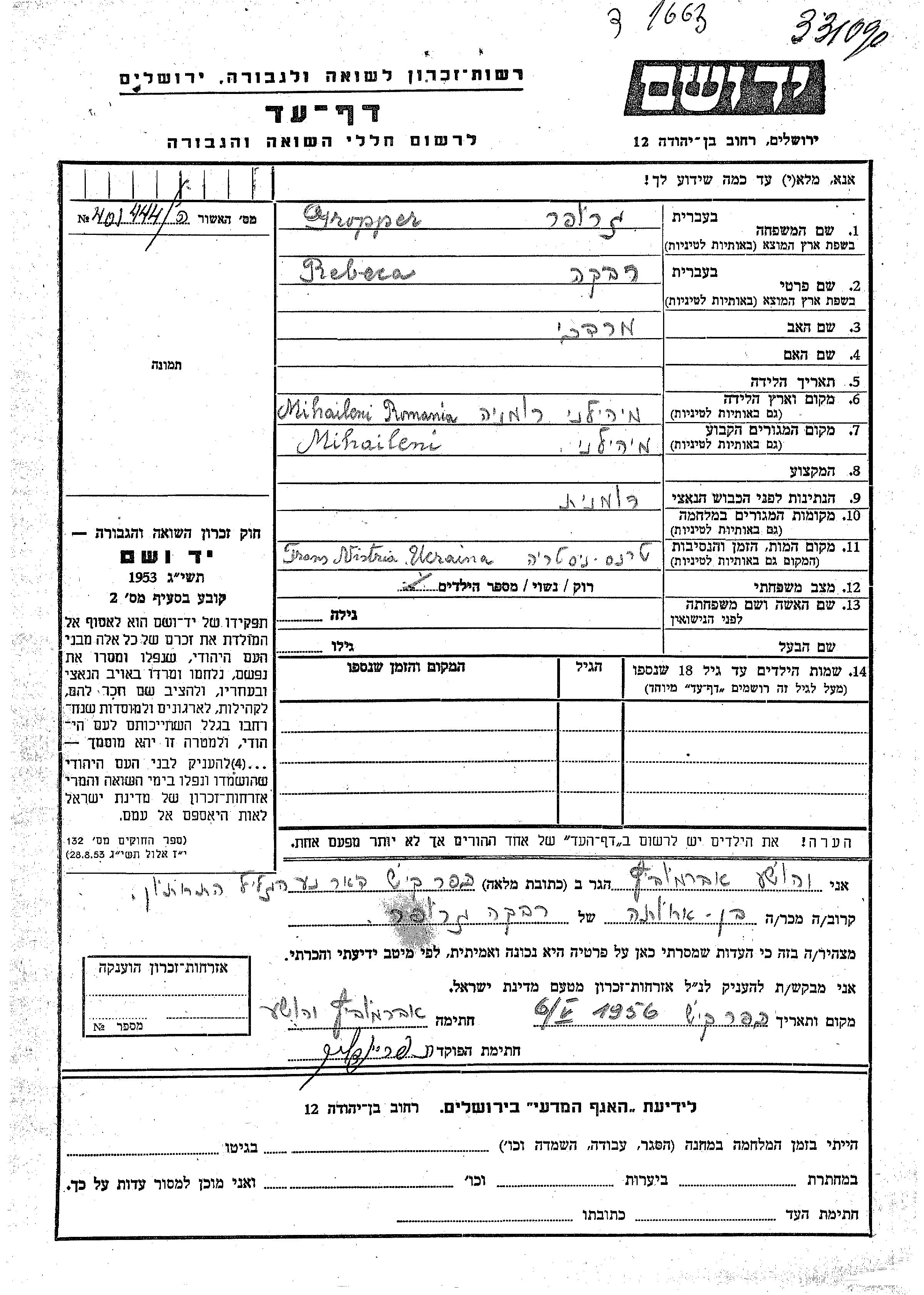 Gropper Rebeca Mihaileni, Rumänien Gedenkblatt
