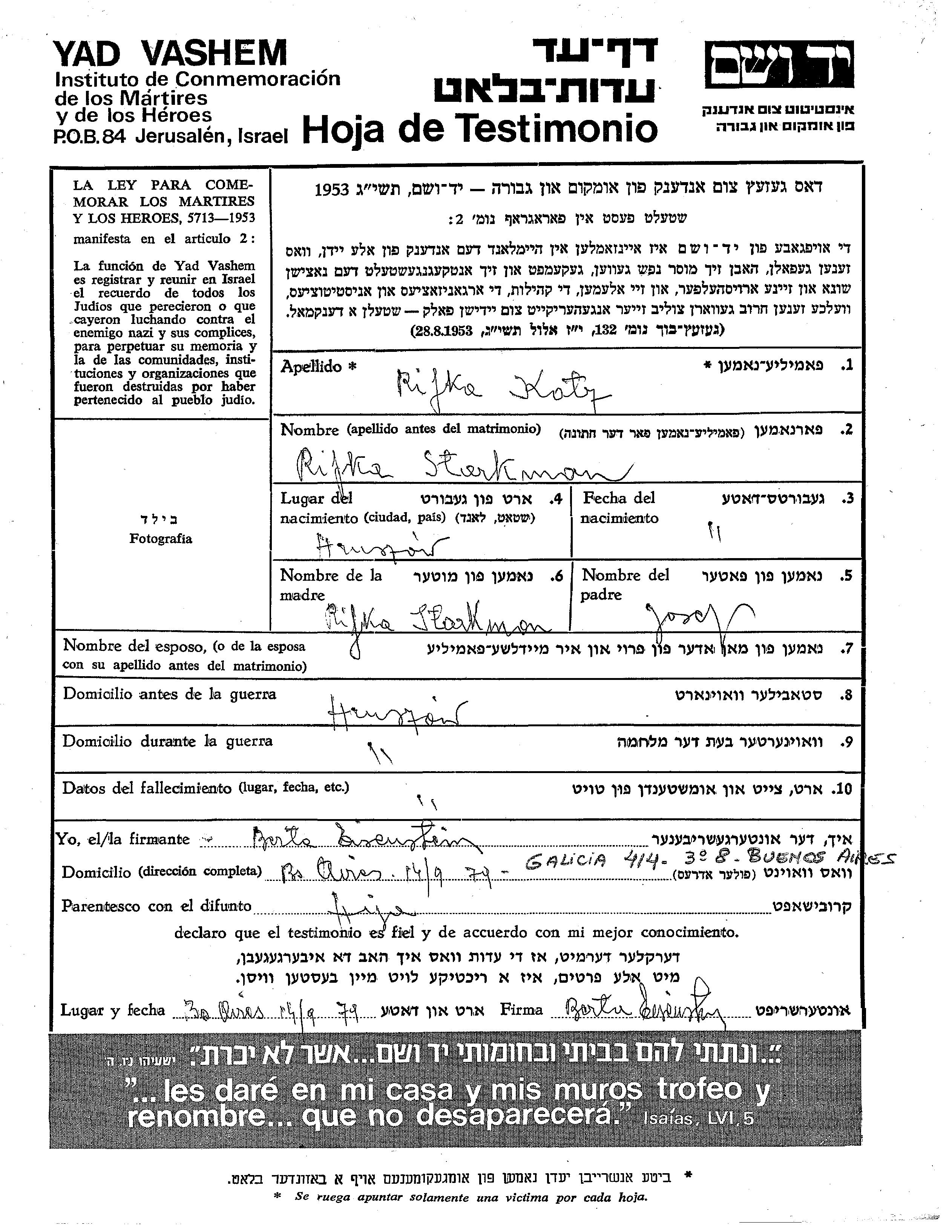 Rivka Katz, geb. Starkman wurde in Hruszow, Polen geboren. Sie war die Tochter von Josep und Rivka. Vor dem Zweiten Weltkrieg lebte sie in Hruszow, Polen. Während des Krieges war sie in Hruszow, Polen.