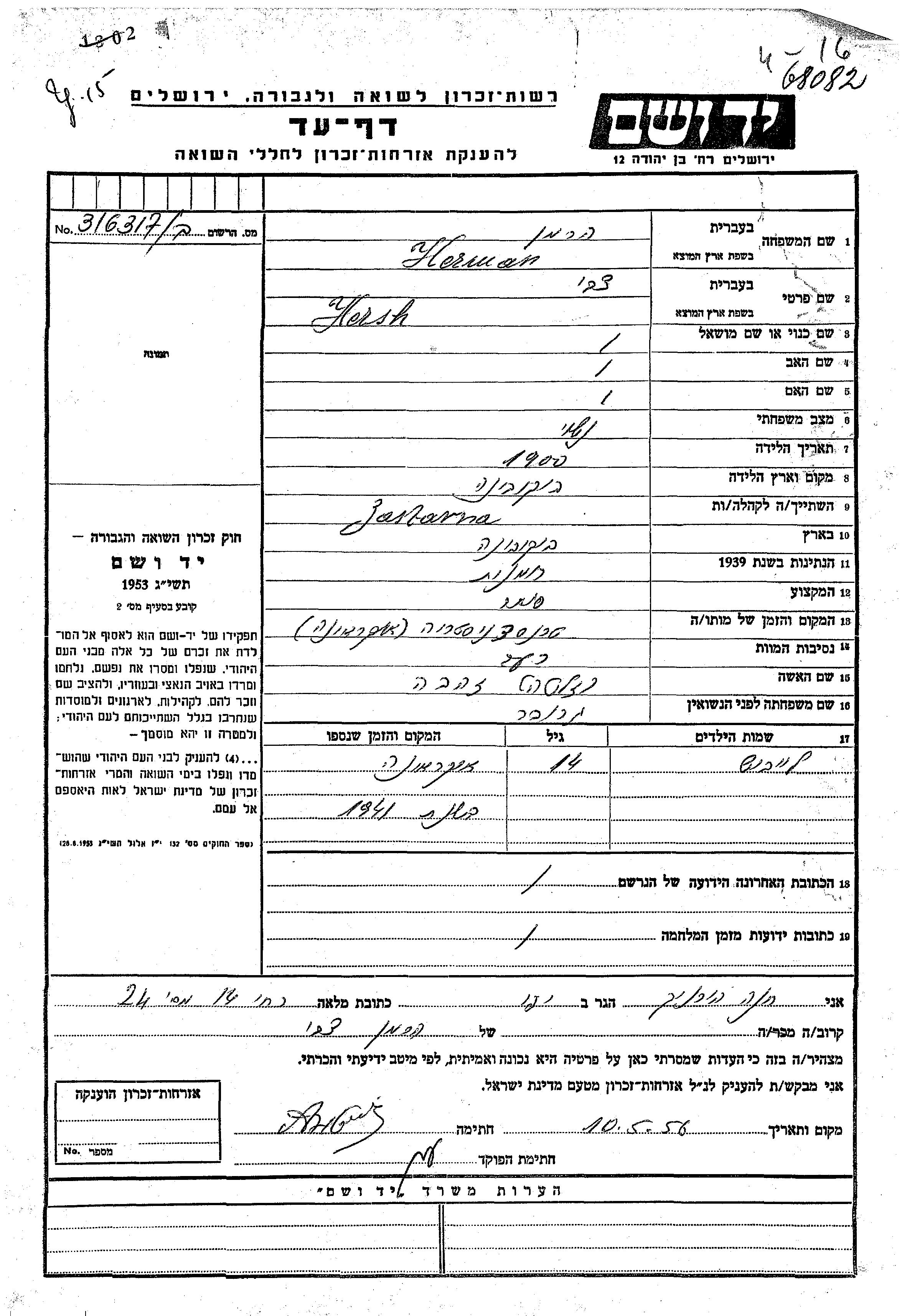Hersh Tzvi Herman wurde im Jahr 1900 in Bukovina, Rumänien geboren. Er war Kaufmann/-frau und mit Zlata Zahava, geb. Gruber Verheiratet. Vor dem Zweiten Weltkrieg lebte er in Zastawna, Rumänien.