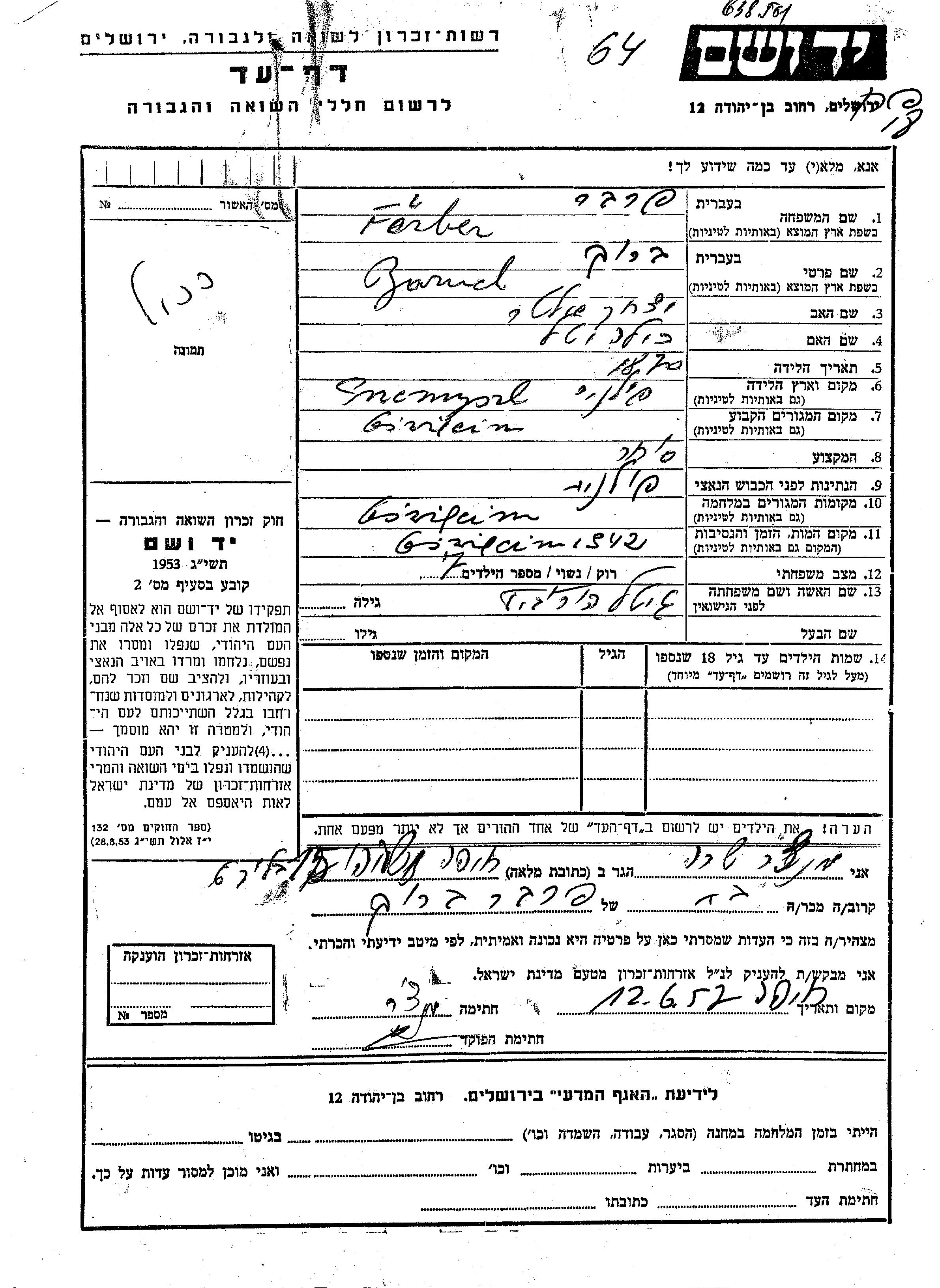Baruch Farber wurde im Jahr 1870 in Przemysl, Polen geboren. Er war der Sohn von Yitzkhak Alter und Bila Ietel. Er war Kaufmann/-frau und mit Gitel, geb. Horovitz Verheiratet. Vor dem Zweiten Weltkrieg lebte er in Oświęcim, Polen. Während des Krieges war er in Oświęcim, Polen.