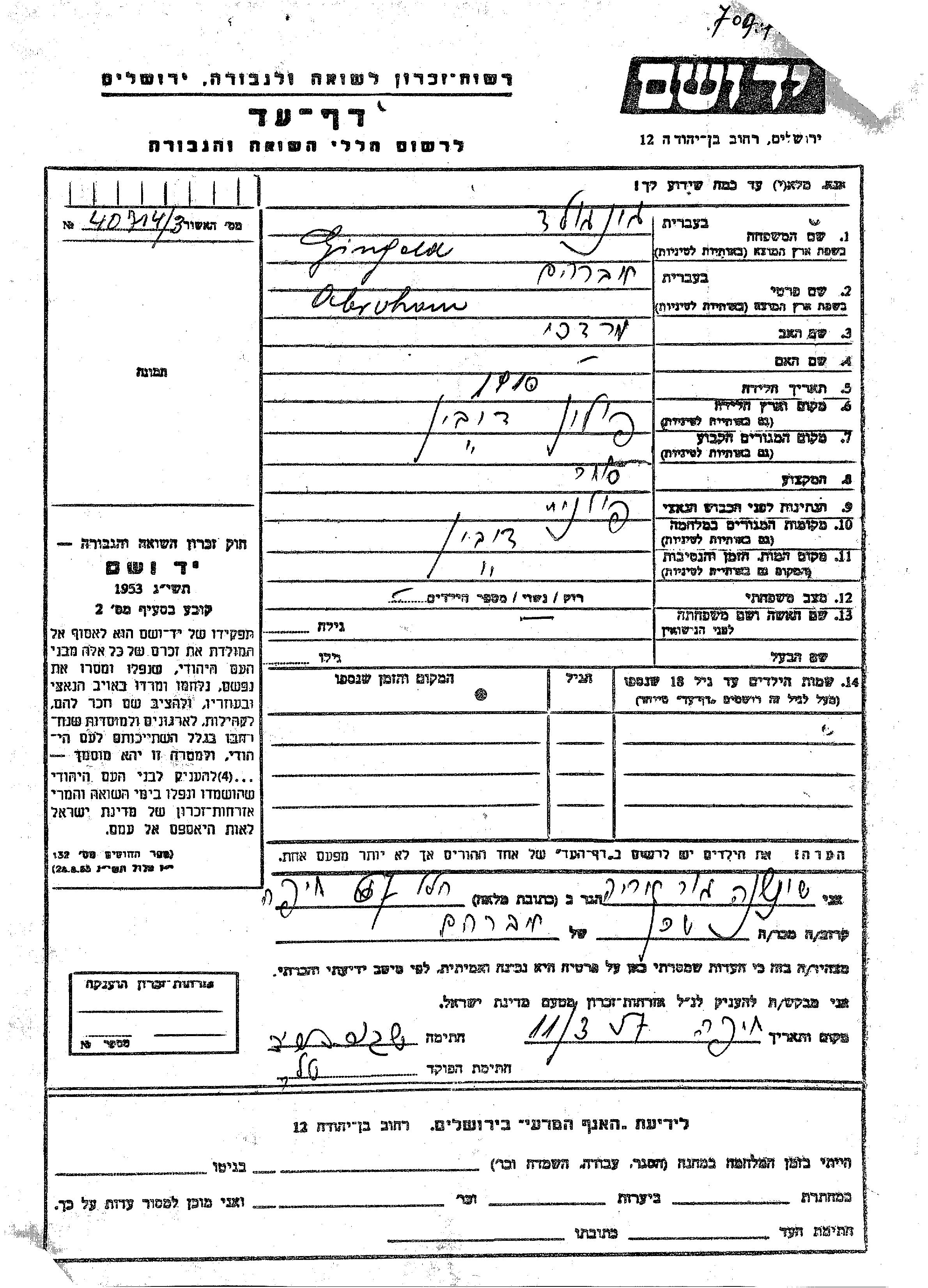 Abruham Gingold wurde im Jahr 1910 in Dyvin, Polen geboren. Er war der Sohn von Mordekhai. Er war Kaufmann/-frau und Verheiratet. Vor dem Zweiten Weltkrieg lebte er in Dyvin, Polen. Während des Krieges war er in Dyvin, Polen.