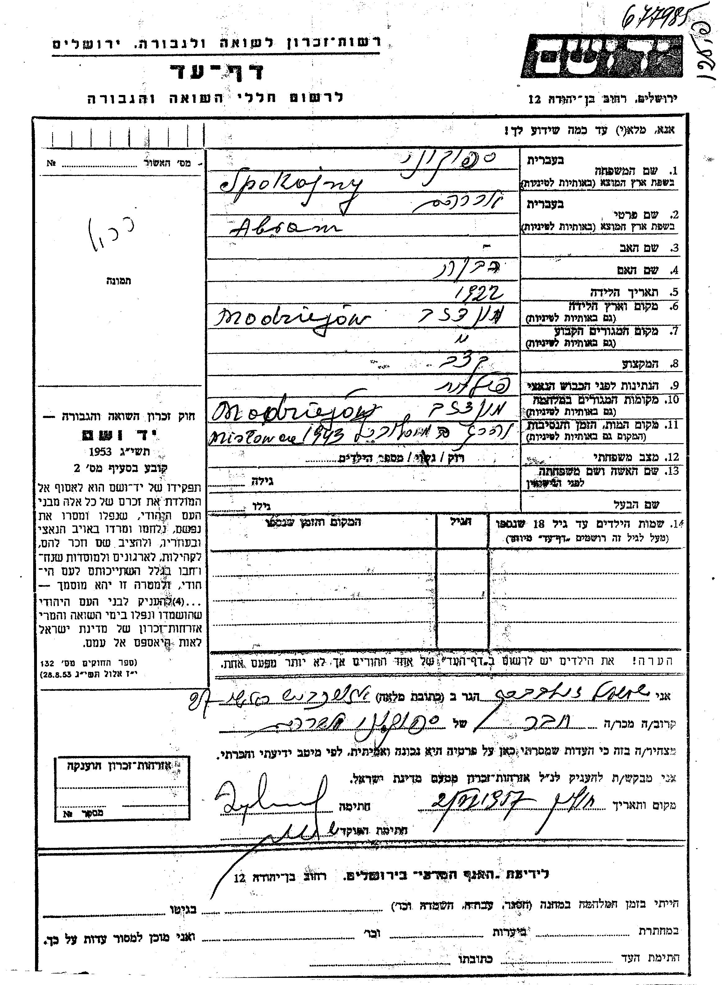 Abram Spokojny wurde im Jahr 1922 in Mondziejow, Polen geboren. Er war der Sohn von Rivka. Er war Metzger/-in und Ledig. Vor dem Zweiten Weltkrieg lebte er in Mondziejow, Polen. Während des Krieges war er in Mondziejow, Polen.
