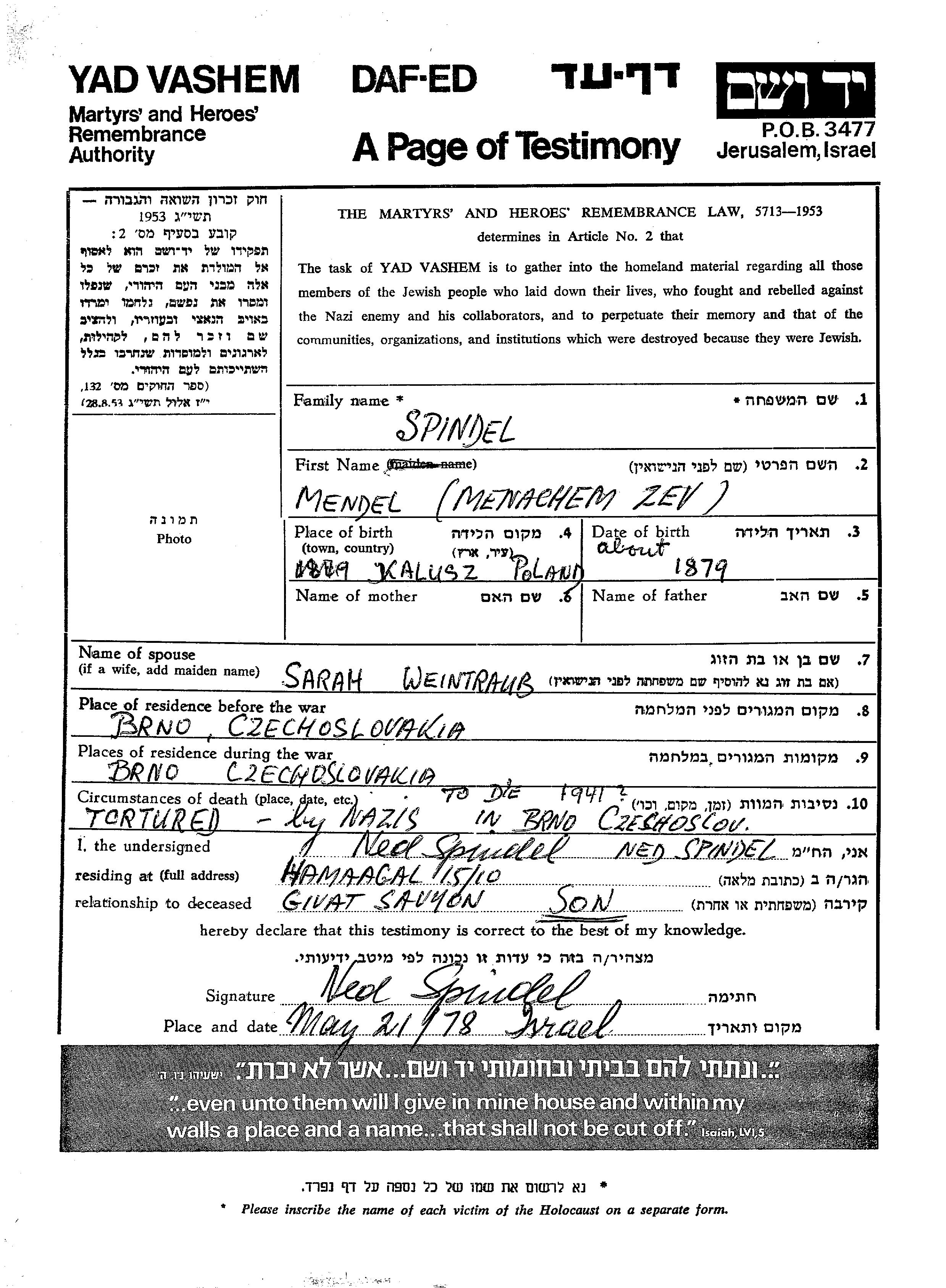 Mendel Menachem Zeev Spindel wurde im Jahr 1879 in Kalusz, Polen geboren. Er war mit Sarah, geb. Weintraub Verheiratet. Vor dem Zweiten Weltkrieg lebte er in Brno, Tschechoslowakei. Während des Krieges war er in Brno, Tschechoslowakei.