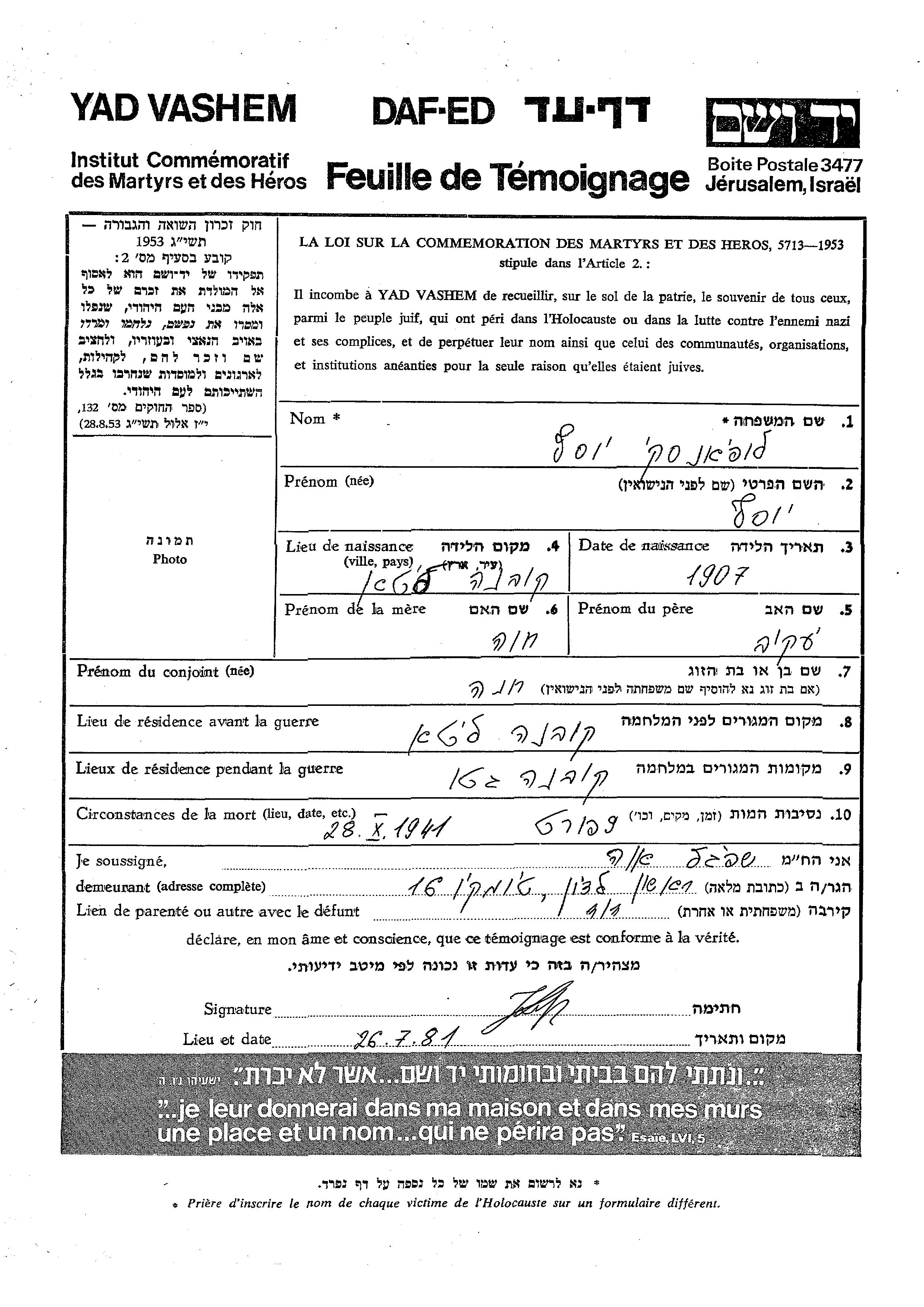 Yosef wurde in der Schoah ermordet. Todesort: Fort 9, Litauen im Jahr 28/10/1941.