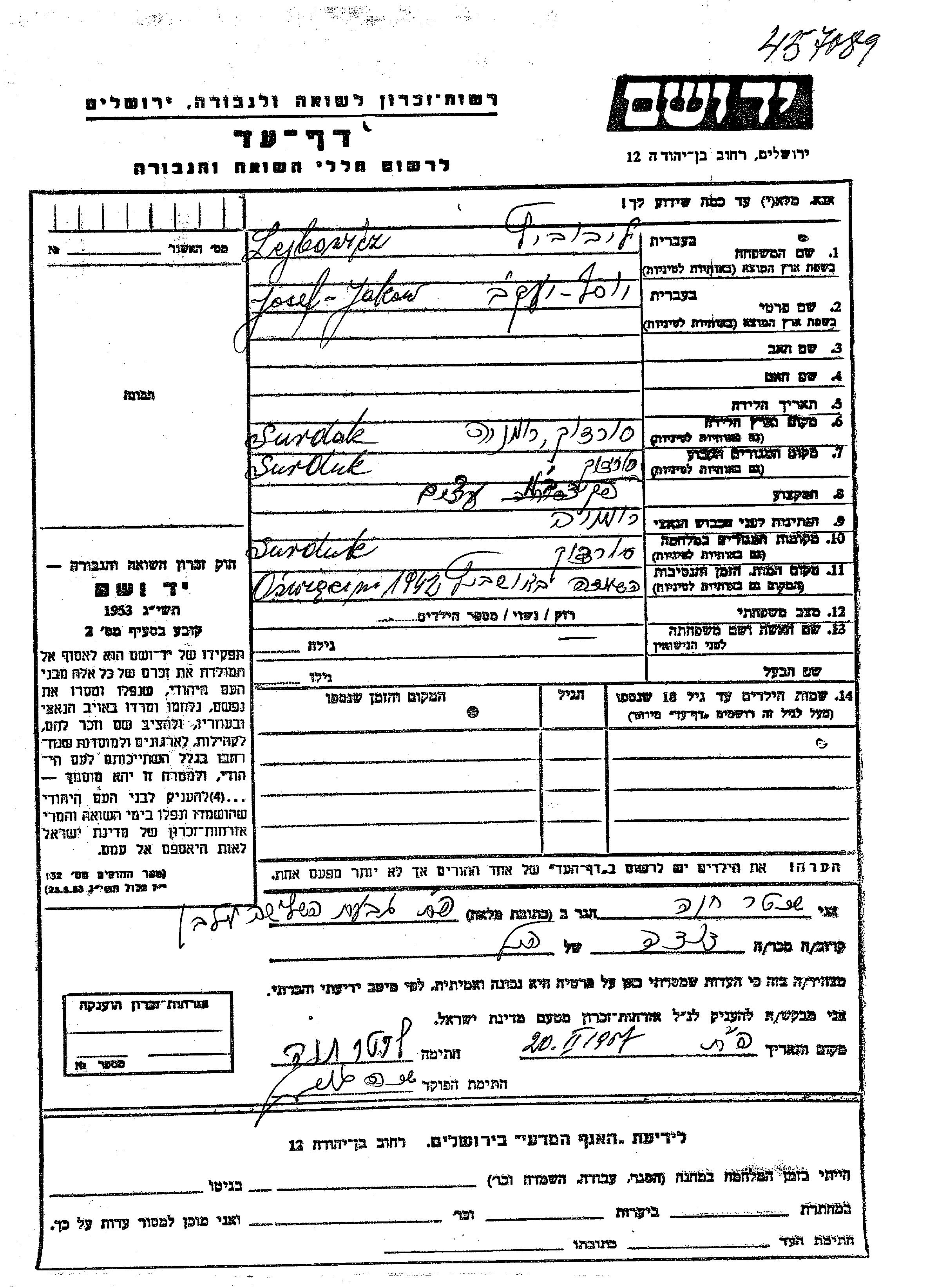 Josef Jakow Lejbowicz wurde in Surduc, Rumänien geboren. Er war פקיד בבית מסחר לעצים und Ledig. Vor dem Zweiten Weltkrieg lebte er in Surduc, Rumänien. Während des Krieges war er in Surduc, Rumänien.