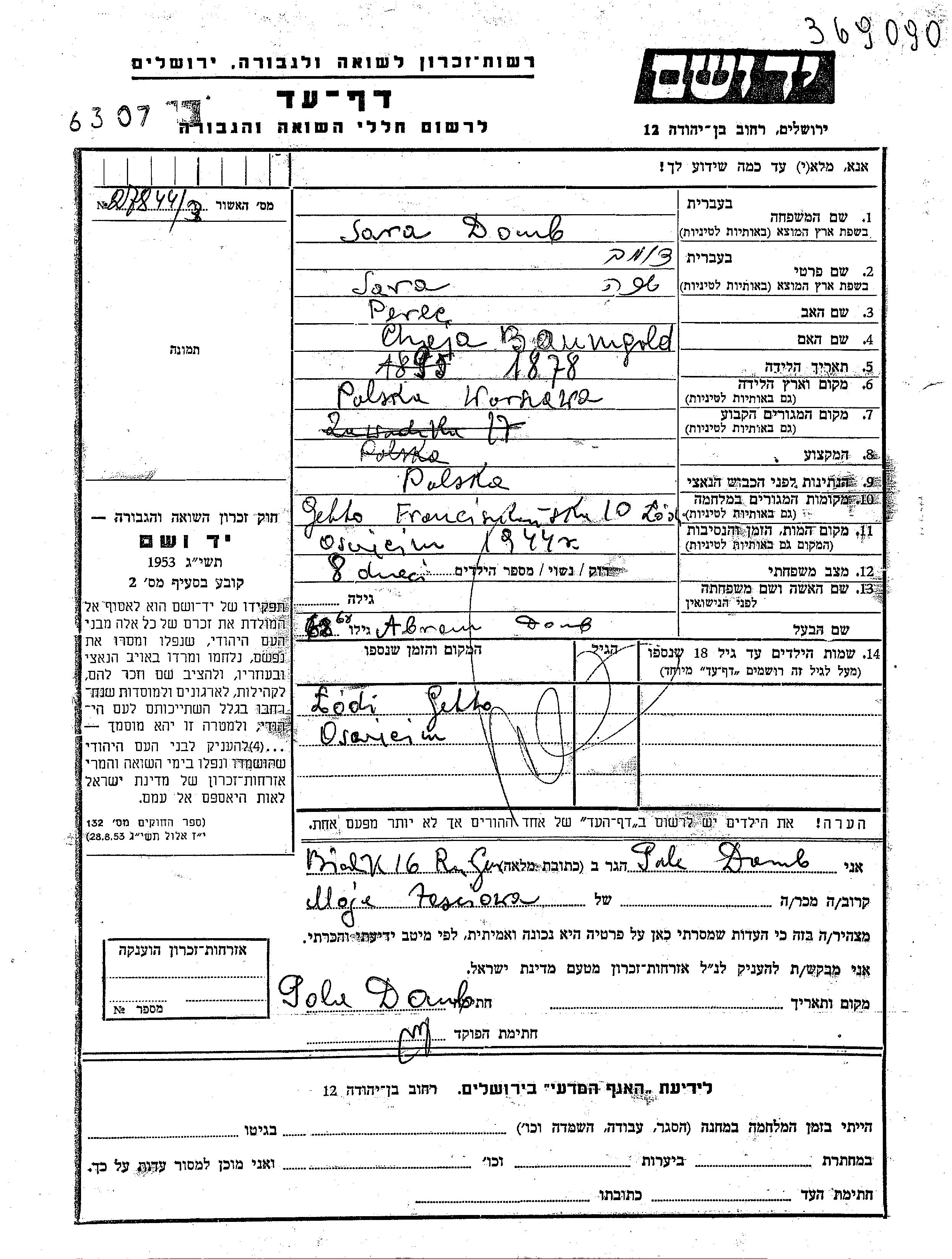 Sara Domb wurde im Jahr 1878 in Warsaw, Polen geboren. Sie war die Tochter von Perec und Chaja. Sie war mit Abram Verheiratet. Während des Krieges war sie in Lodz, Polen.