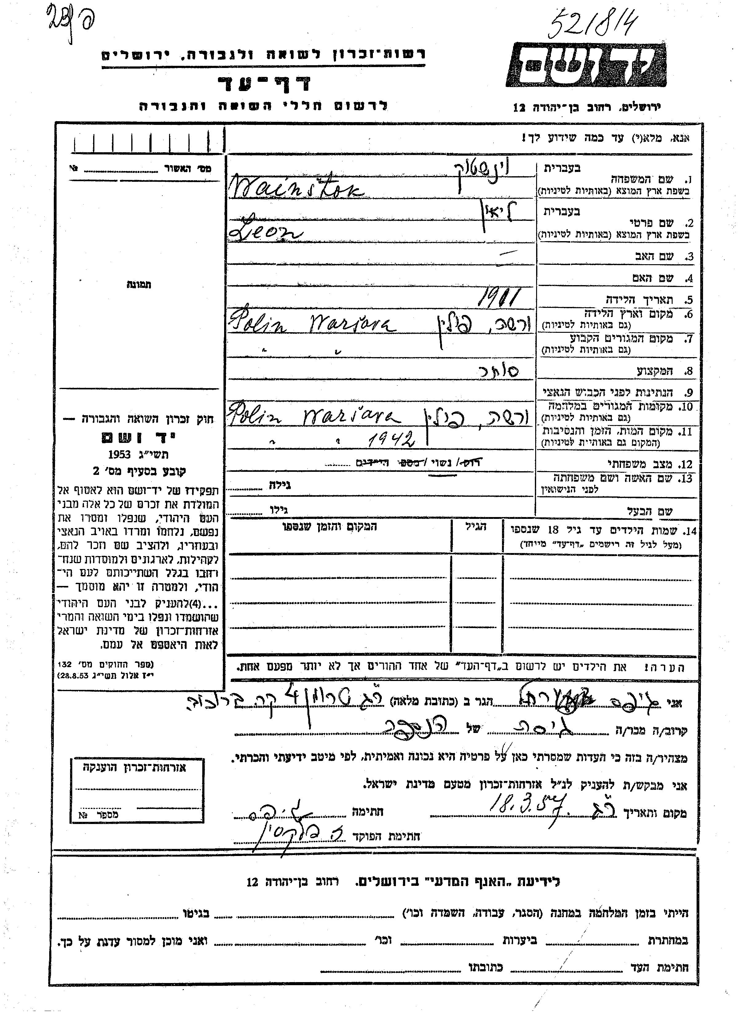 Lion Wainstok wurde im Jahr 1901 in Warszawa, Polen geboren. Er war Kaufmann/-frau und Verheiratet. Vor dem Zweiten Weltkrieg lebte er in Warszawa, Polen. Während des Krieges war er in Warszawa, Polen.
