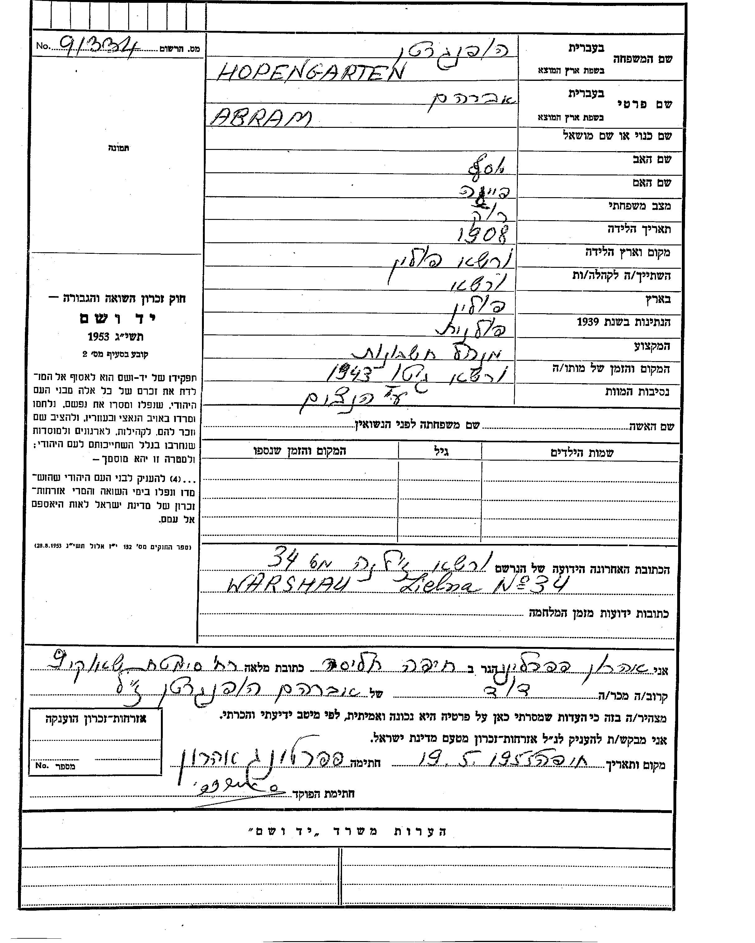 Abram Hopengarten wurde im Jahr 1908 in Warsaw, Polen geboren. Er war der Sohn von Yosef und Feiga. Er war Buchhalter/-in und Ledig. Vor dem Zweiten Weltkrieg lebte er in Warsaw, Polen. Während des Krieges war er in Warsaw, Polen.