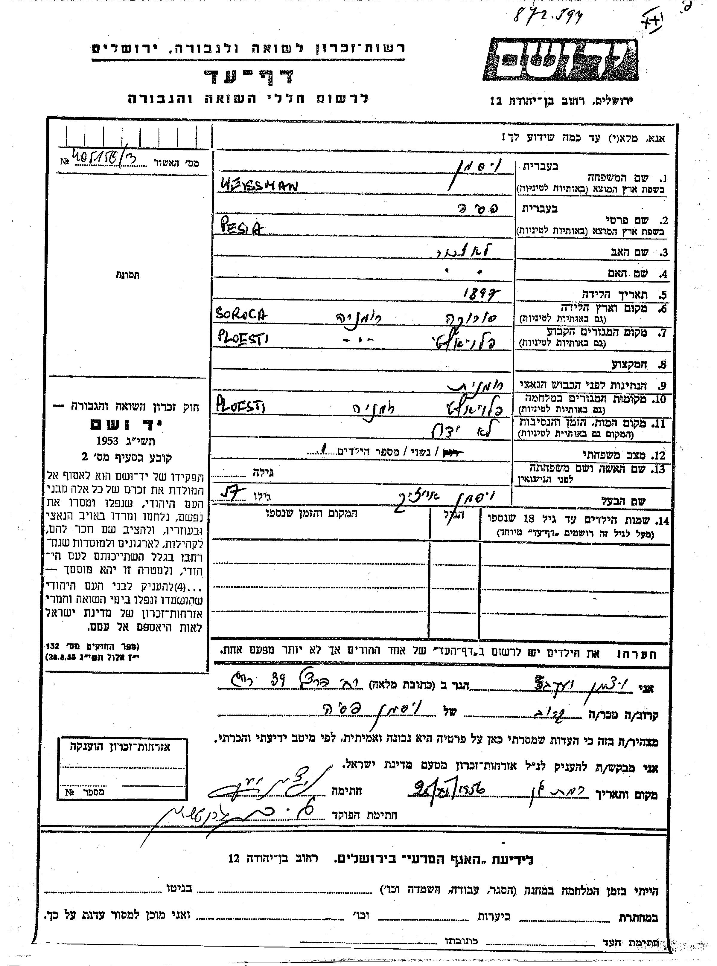 Pesia Veisman wurde im Jahr 1897 in Soroca, Rumänien geboren. Sie war mit Aizik Verheiratet. Vor dem Zweiten Weltkrieg lebte sie in Ploesti, Rumänien. Während des Krieges war sie in Ploesti, Rumänien.
