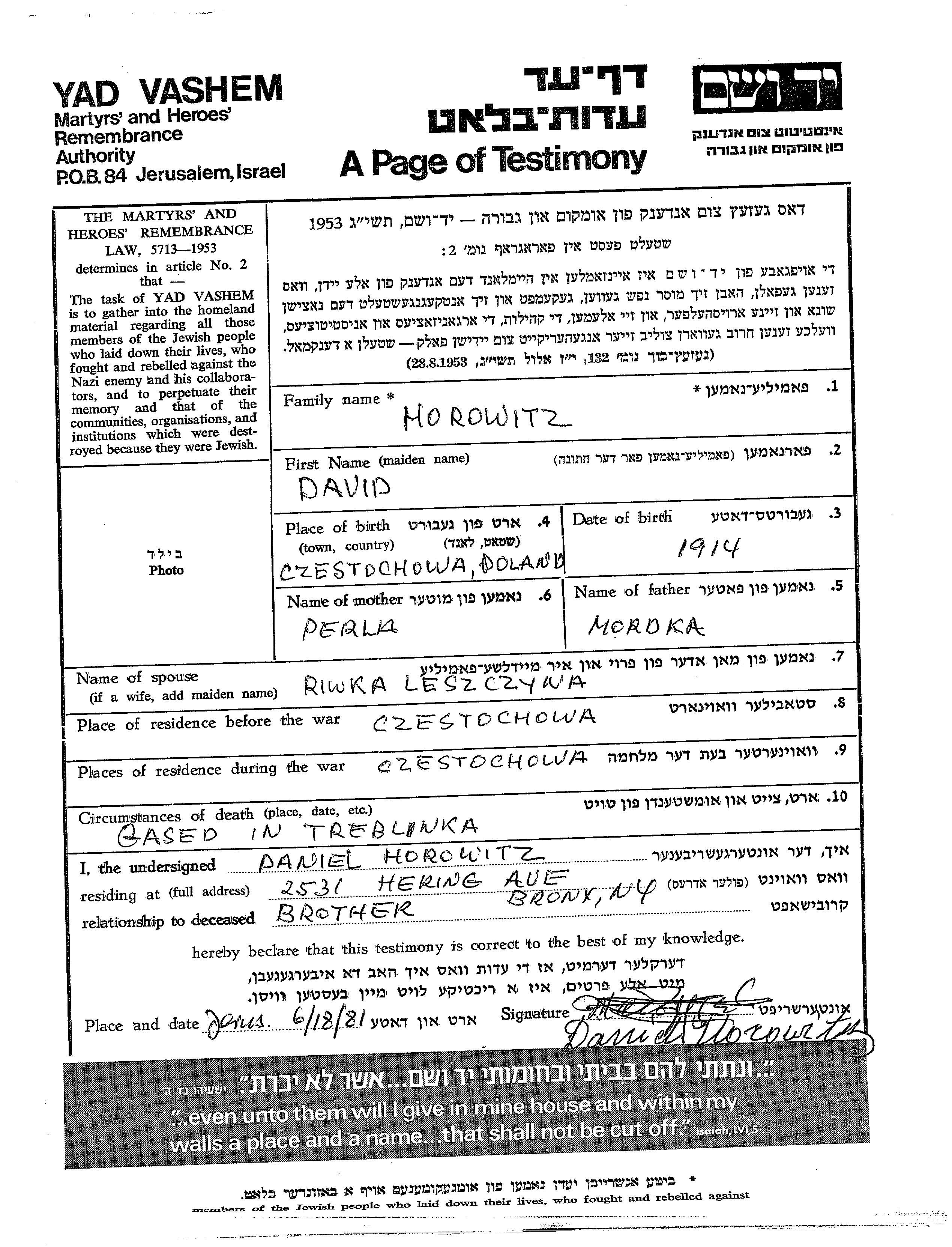 Morowitz David 1914 Czestochowa, Polen Gedenkblatt
