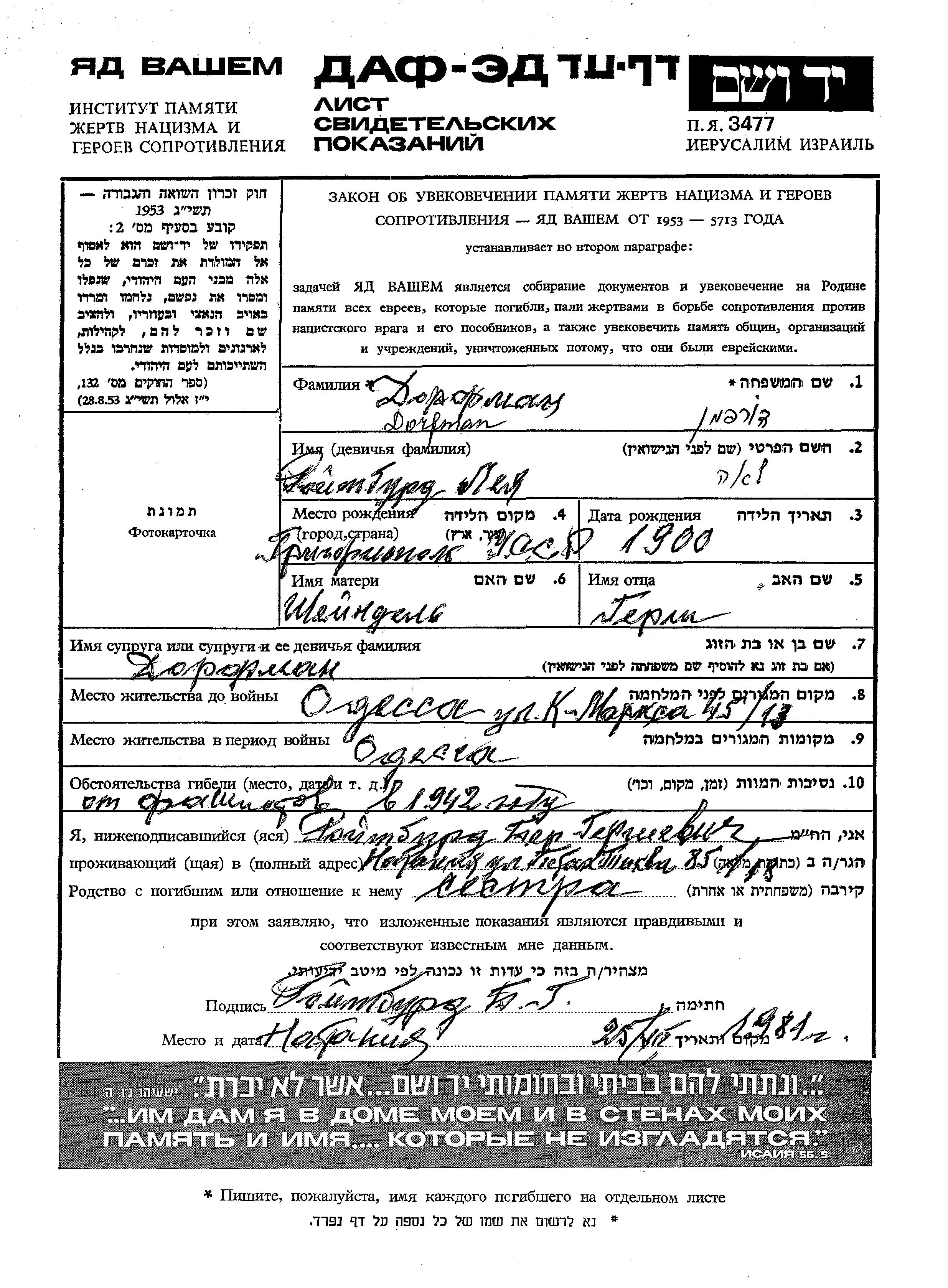 Leya Dorfman, geb. Roitburg wurde im Jahr 1900 in Grigoriopol, Ukraine (UdSSR) geboren. Sie war die Tochter von Gersh und Sheindl. Sie war Verheiratet. Vor dem Zweiten Weltkrieg lebte sie in Odessa, Ukraine (UdSSR). Während des Krieges war sie in Odessa, Ukraine (UdSSR).