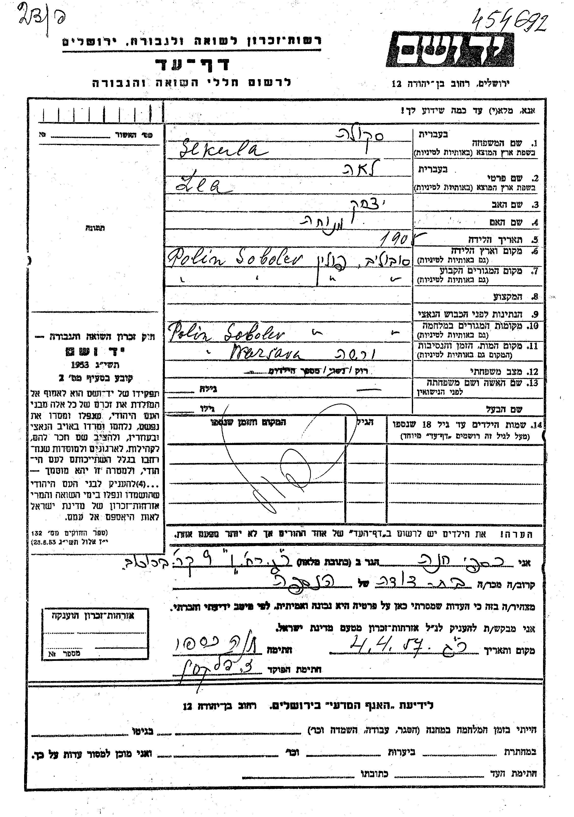 Lea Sekula wurde im Jahr 1905 in Sobolew, Polen geboren. Sie war die Tochter von Yitzkhak und Menukha. Sie war Ledig. Vor dem Zweiten Weltkrieg lebte sie in Sobolew, Polen. Während des Krieges war sie in Sobolew, Polen.