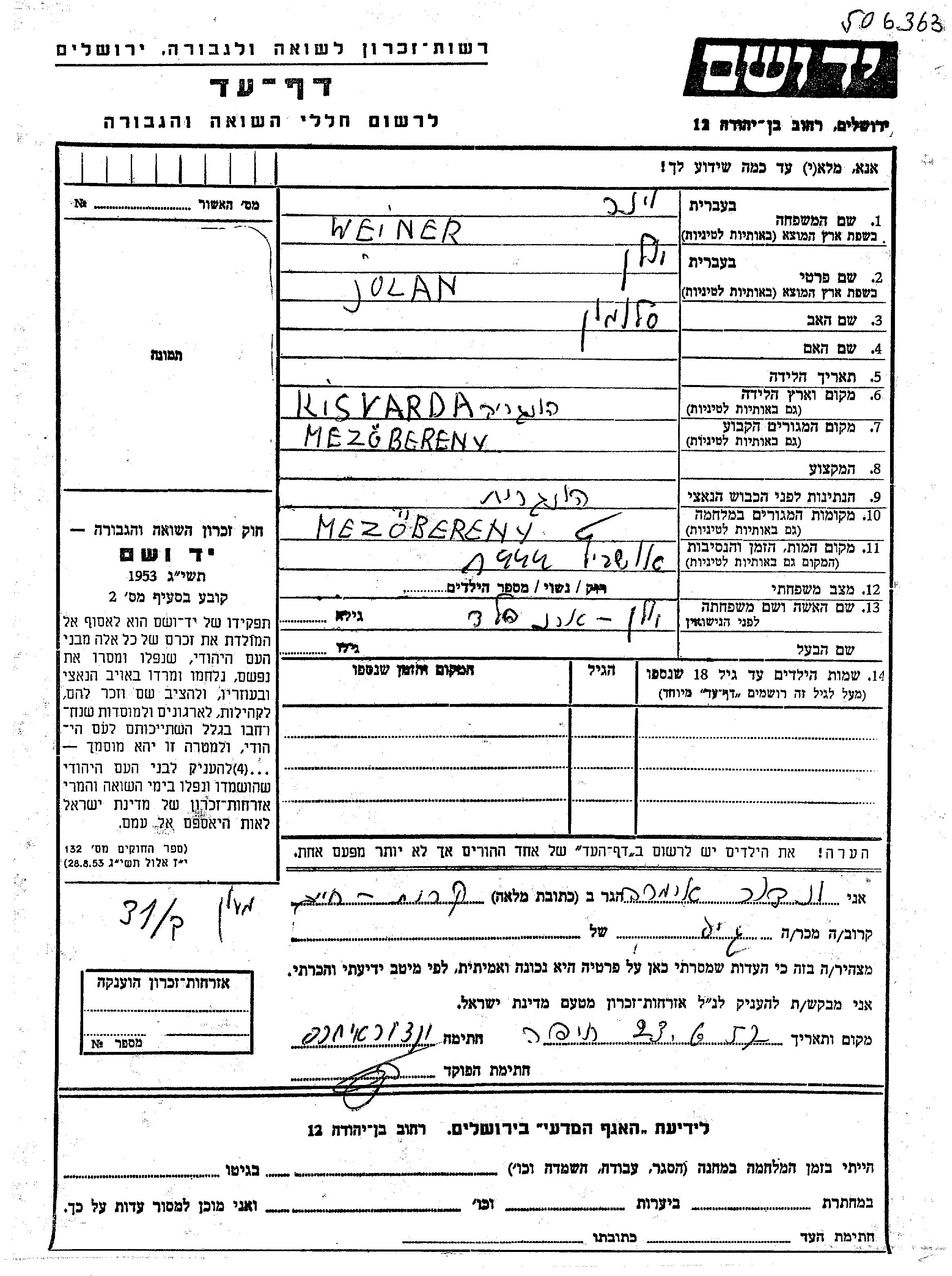 Jolan Weiner Viner, geb. Arnfeld wurde in Kisvarda, Ungarn geboren. Sie war die Tochter von Salomon. Sie war Verheiratet. Vor dem Zweiten Weltkrieg lebte sie in Mezobereny, Ungarn. Während des Krieges war sie in Mezobereny, Ungarn.
