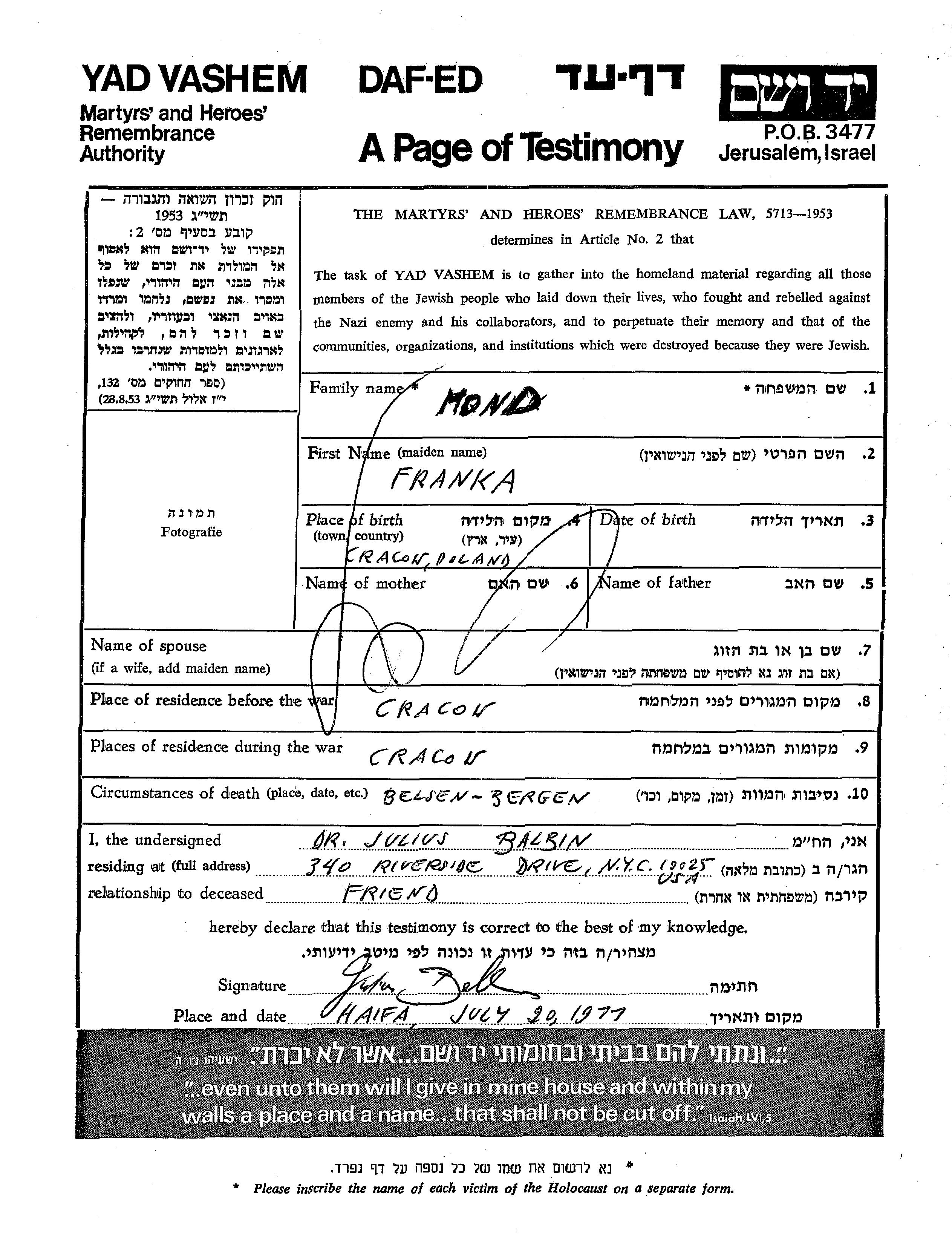 Franka Mond wurde in Krakow, Polen geboren. Vor dem Zweiten Weltkrieg lebte sie in Krakow, Polen. Während des Krieges war sie in Krakow, Polen.