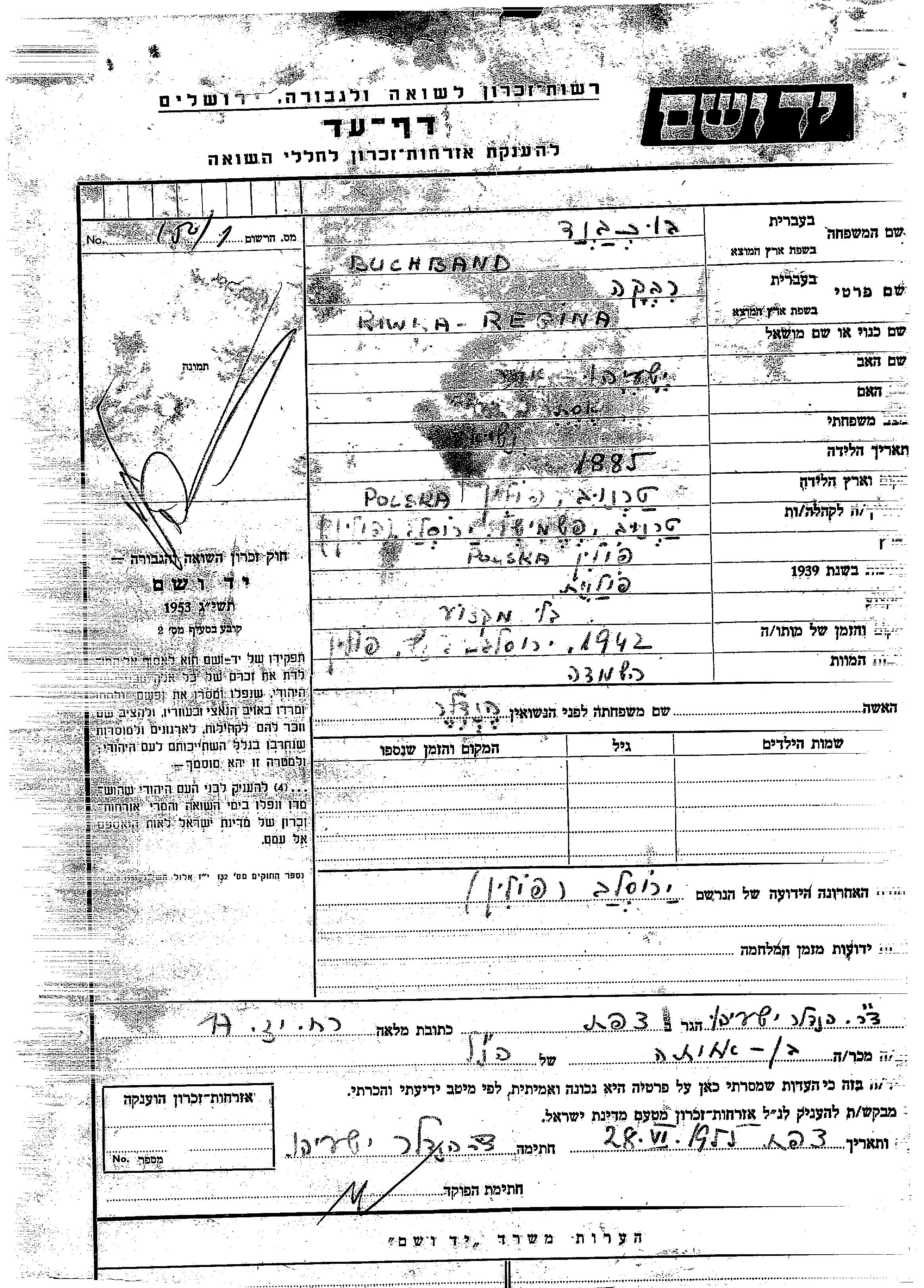 Riwka Regina Buchband, geb. Hendler wurde im Jahr 1885 in Tarnow, Polen geboren. Sie war die Tochter von Yeshayahu und Ester. Sie war Verheiratet. Vor dem Zweiten Weltkrieg lebte sie in Tarnow, Polen. Während des Krieges war sie in Jaroslaw, Polen.