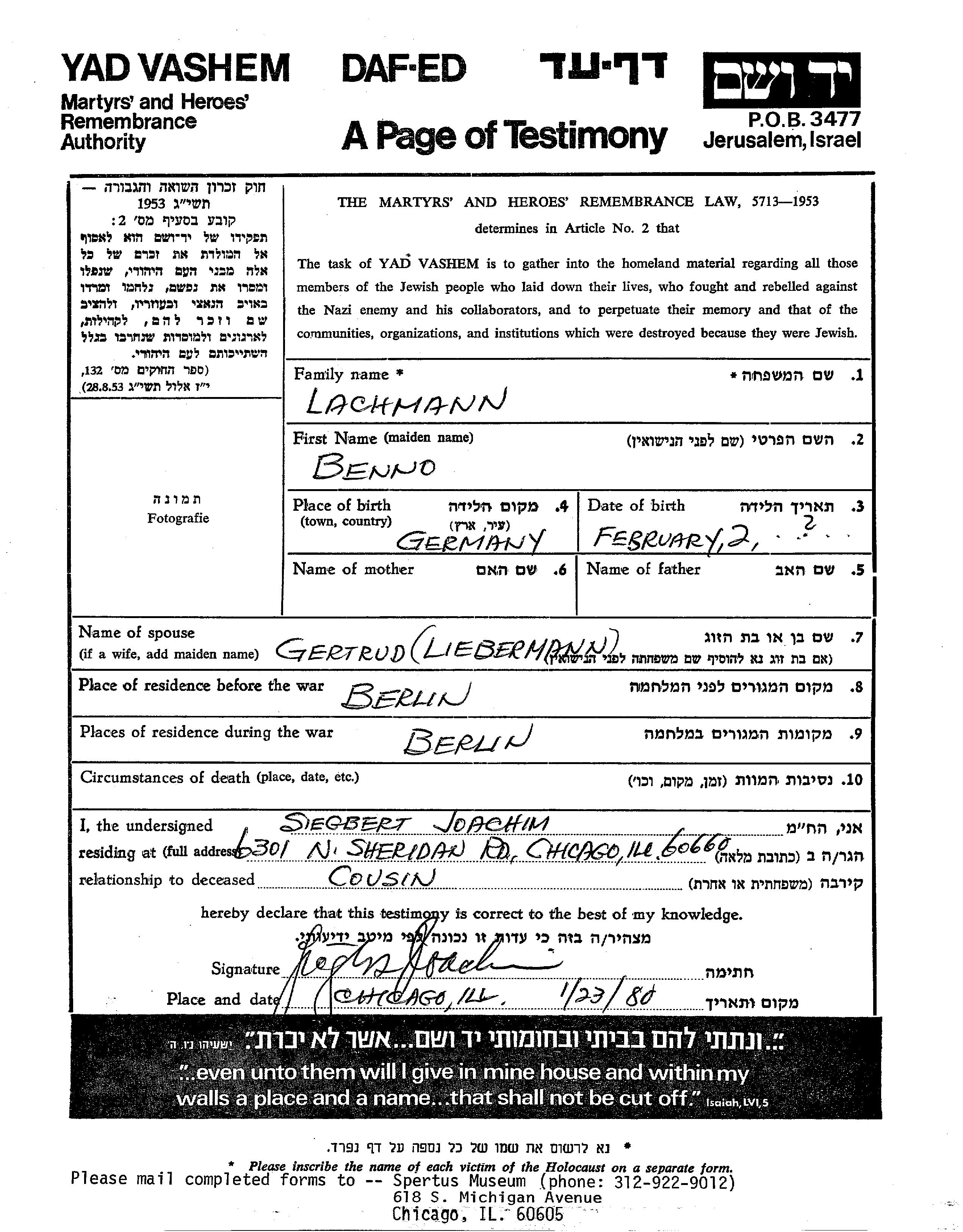 Benno Lachmann wurde in Deutsches Reich geboren. Vor dem Zweiten Weltkrieg lebte er in Berlin, Deutsches Reich. Während des Krieges war er in Berlin, Deutsches Reich.