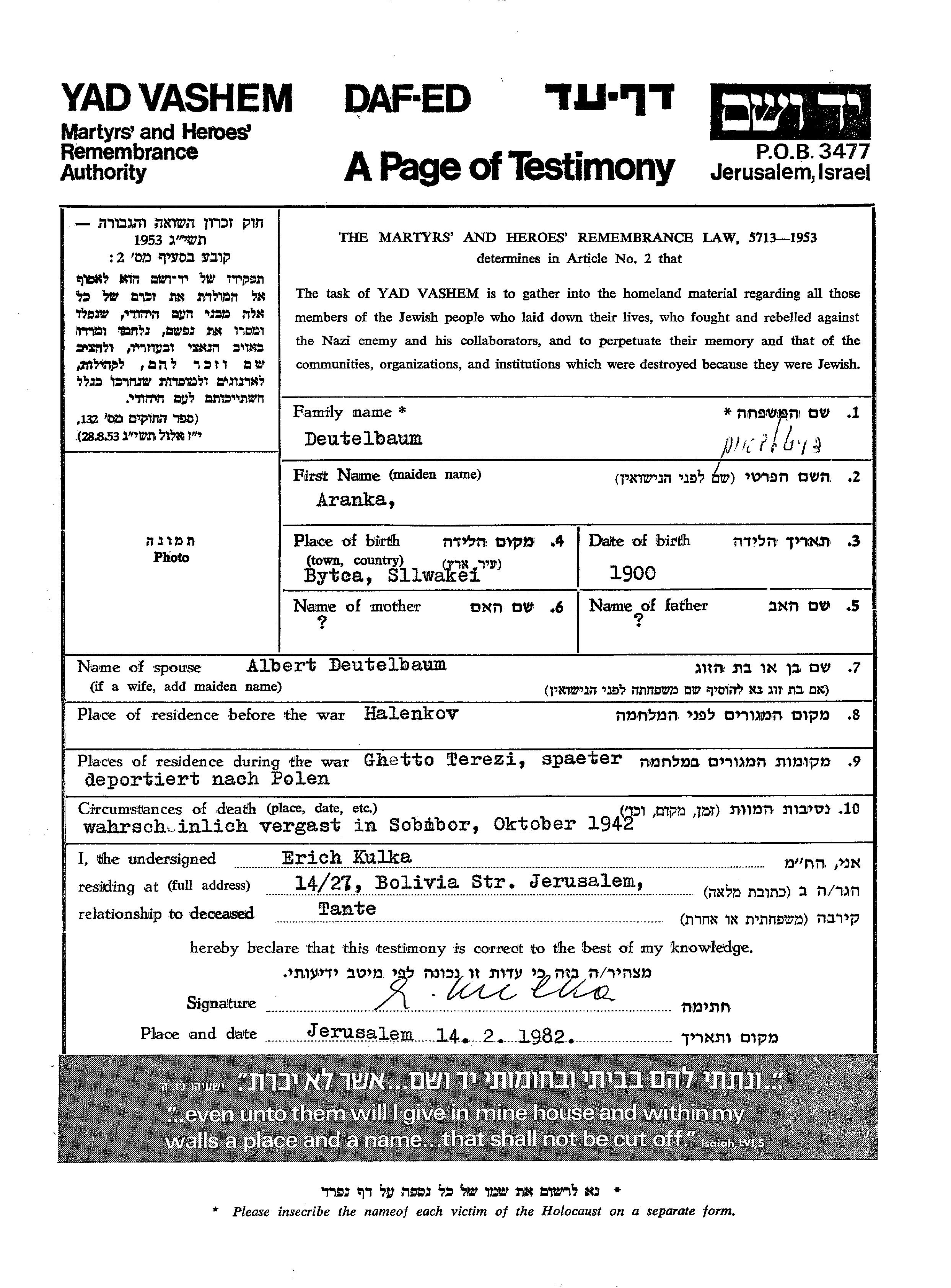 Aranka Deutelbaum wurde im Jahr 1900 in Bytca, Tschechoslowakei geboren. Sie war mit Albert Verheiratet. Vor dem Zweiten Weltkrieg lebte sie in Halenkov, Tschechoslowakei. Während des Krieges war sie in Terezin, Tschechoslowakei.