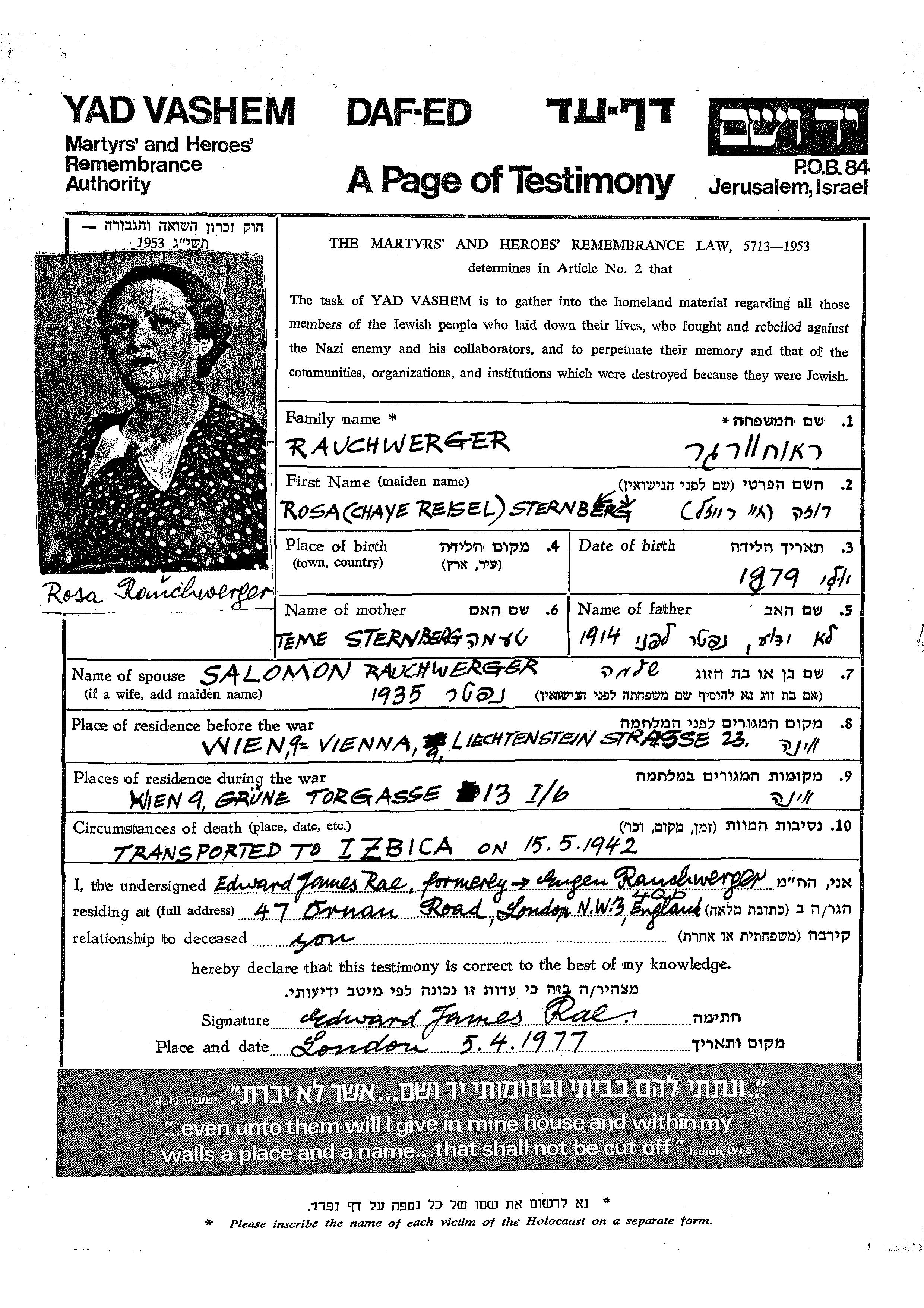 Rosa Chaye Khai Rauchwerger, geb. Sternberg wurde im Jahr 1879 geboren. Sie war die Tochter von Teme Tema. Sie war mit Salomon Verheiratet. Vor dem Zweiten Weltkrieg lebte sie in Wien, Österreich. Während des Krieges war sie in Wien, Österreich.