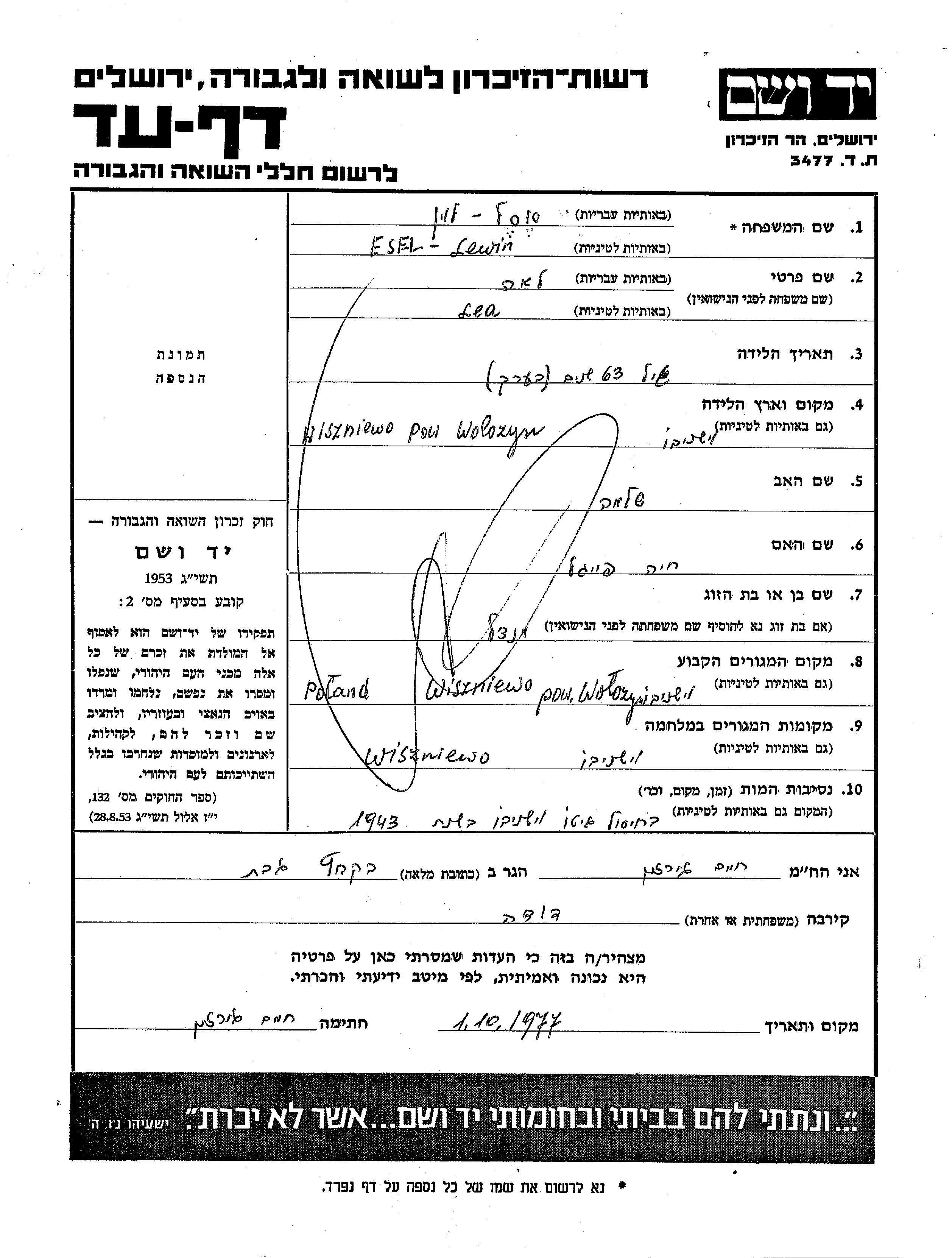Lea Esel, geb. Lewin wurde in Wiszniew, Polen geboren. Sie war die Tochter von Shlomo und Khaia Feigel. Sie war mit Mendel Verheiratet. Vor dem Zweiten Weltkrieg lebte sie in Wiszniew, Polen. Während des Krieges war sie in Wiszniew, Polen.