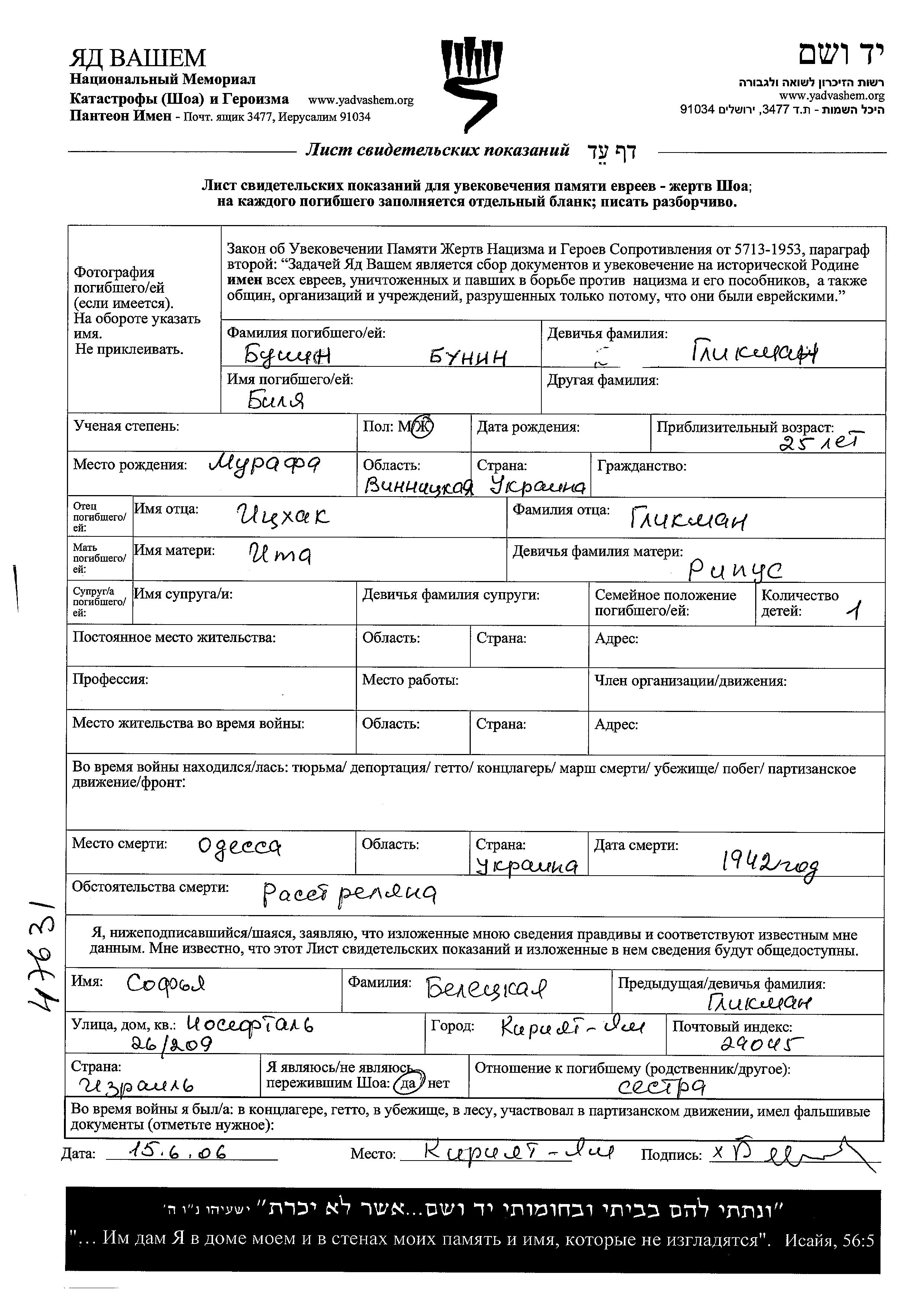 Bilya wurde in der Schoah ermordet. Todesort: Odessa, Ukraine (UdSSR) im Jahr 1942.