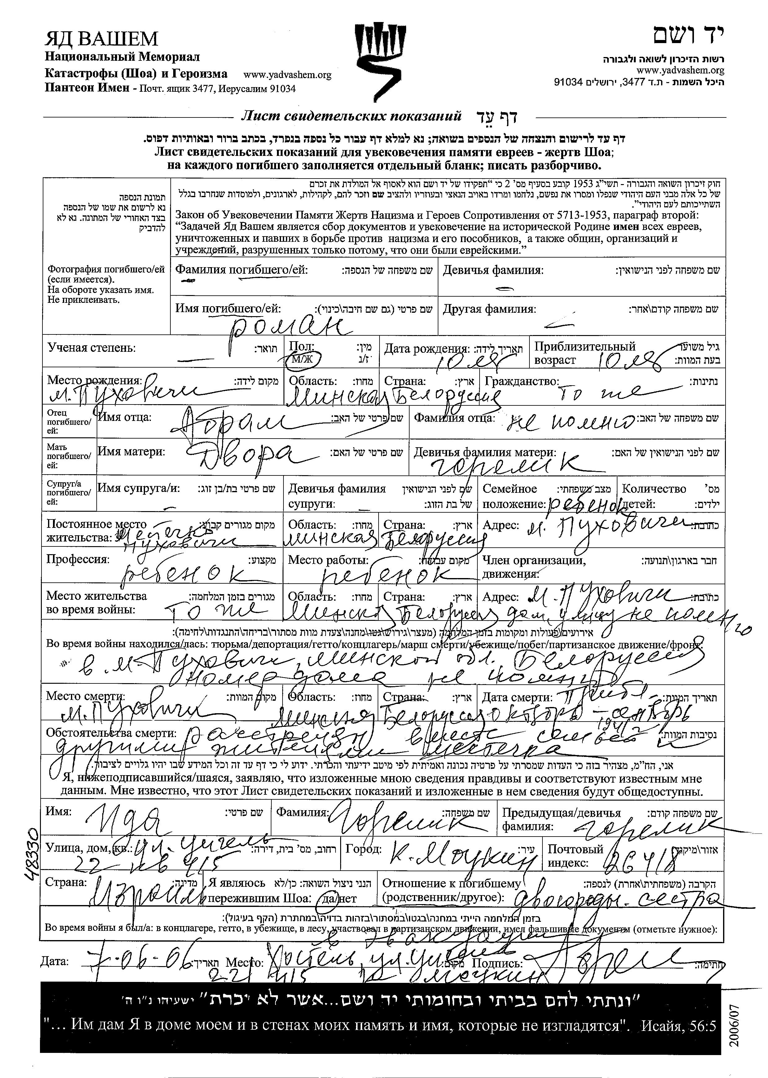 Roman wurde in der Schoah ermordet. Todesort: Pukhovichi, Weißrussland (UdSSR) im Jahr 10/1941.