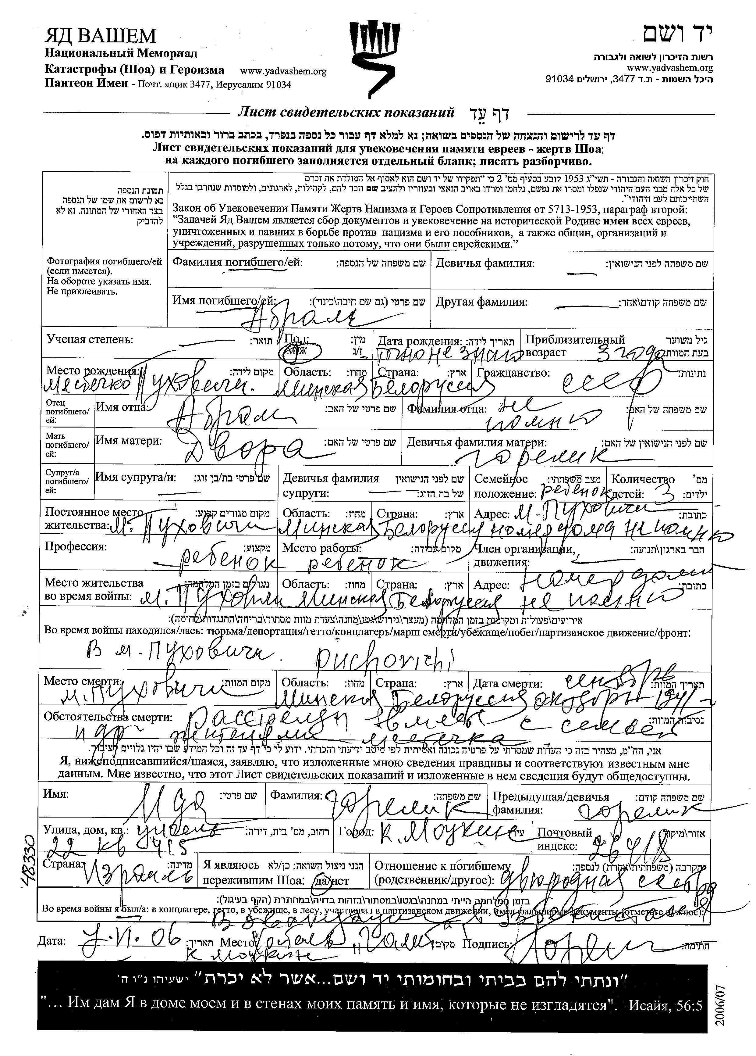 Abram Name unbekannt wurde in Pukhovichi, Weißrussland (UdSSR) geboren. Er war der Sohn von Abram und Dvora, geb. Gorelik. Er war Kind. Vor dem Zweiten Weltkrieg lebte er in Pukhovichi, Weißrussland (UdSSR). Während des Krieges war er in Pukhovichi, Weißrussland (UdSSR).
