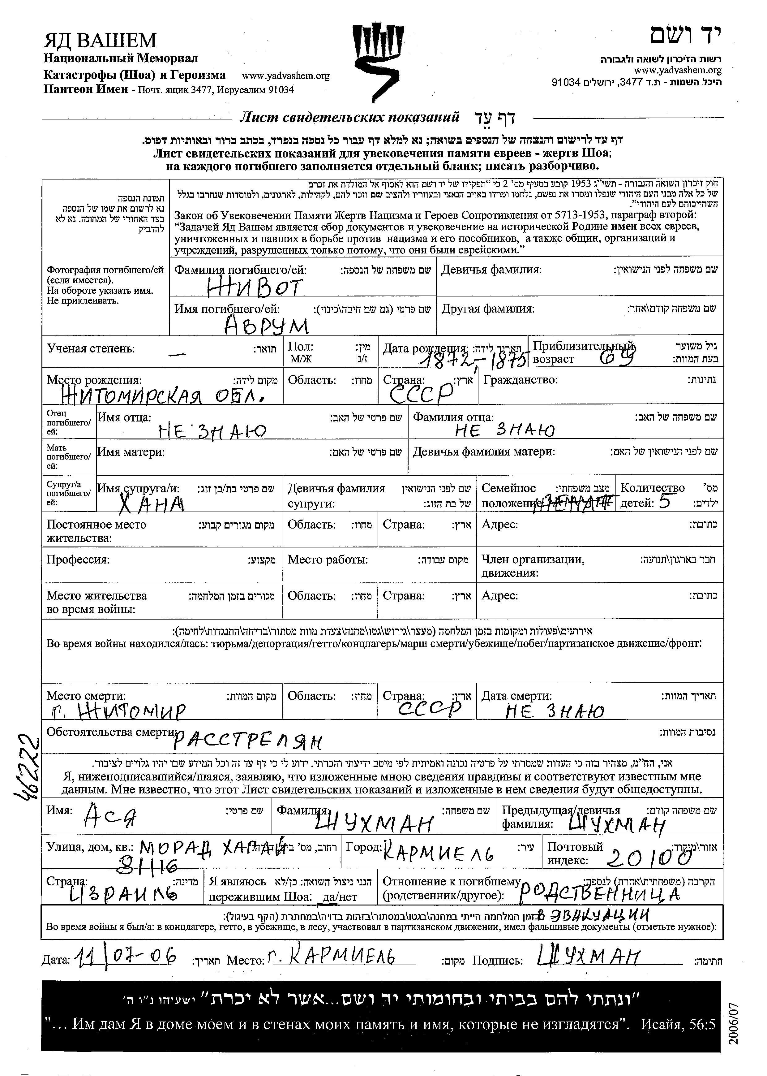 Avrum wurde in der Schoah ermordet. Todesort: Zhitomir, Ukraine (UdSSR).