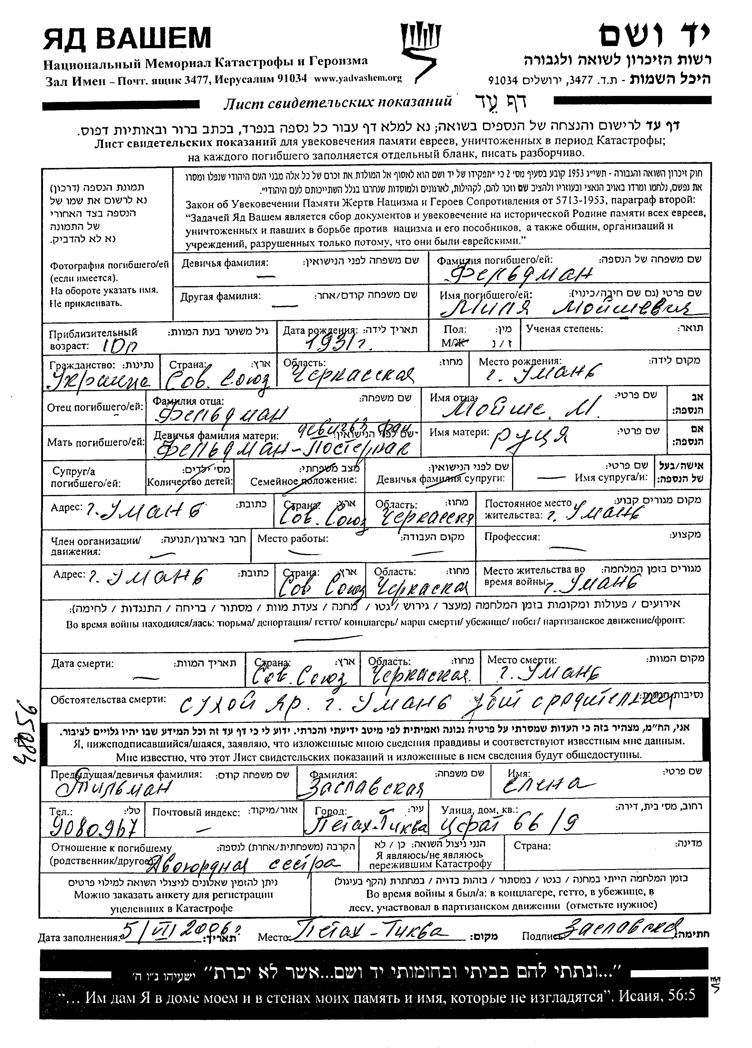 Milya Feldman wurde im Jahr 1931 in Uman, Ukraine (UdSSR) geboren. Er war der Sohn von Moishe und Rutzya, geb. Posternak. Er war Kind. Vor dem Zweiten Weltkrieg lebte er in Uman, Ukraine (UdSSR). Während des Krieges war er in Uman, Ukraine (UdSSR).