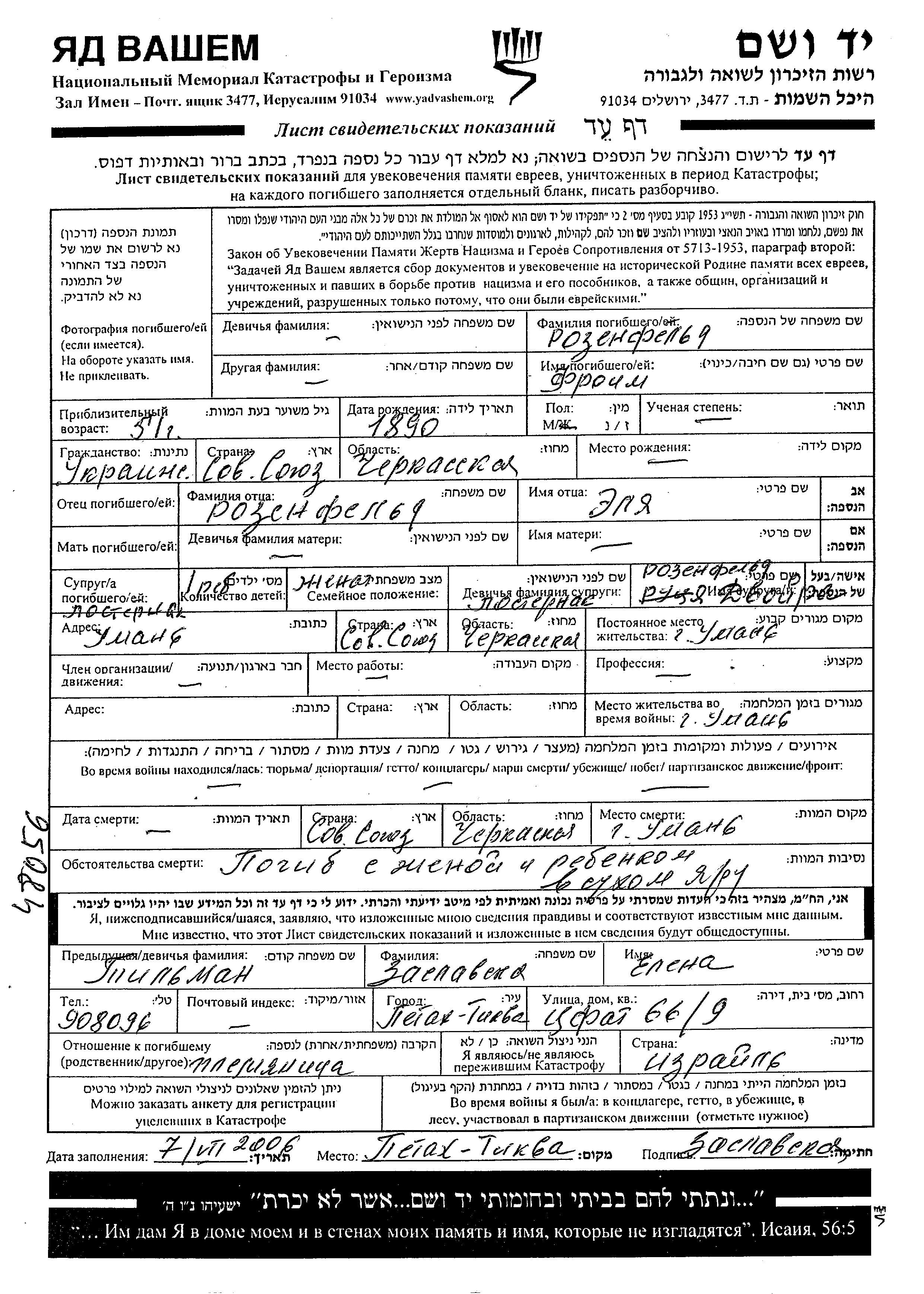Froim Rozenfeld wurde im Jahr 1890 in Cherkassy, Ukraine (UdSSR) geboren. Er war der Sohn von Elya. Er war mit Dvoira, geb. Posternak Verheiratet. Vor dem Zweiten Weltkrieg lebte er in Uman, Ukraine (UdSSR). Während des Krieges war er in Uman, Ukraine (UdSSR).