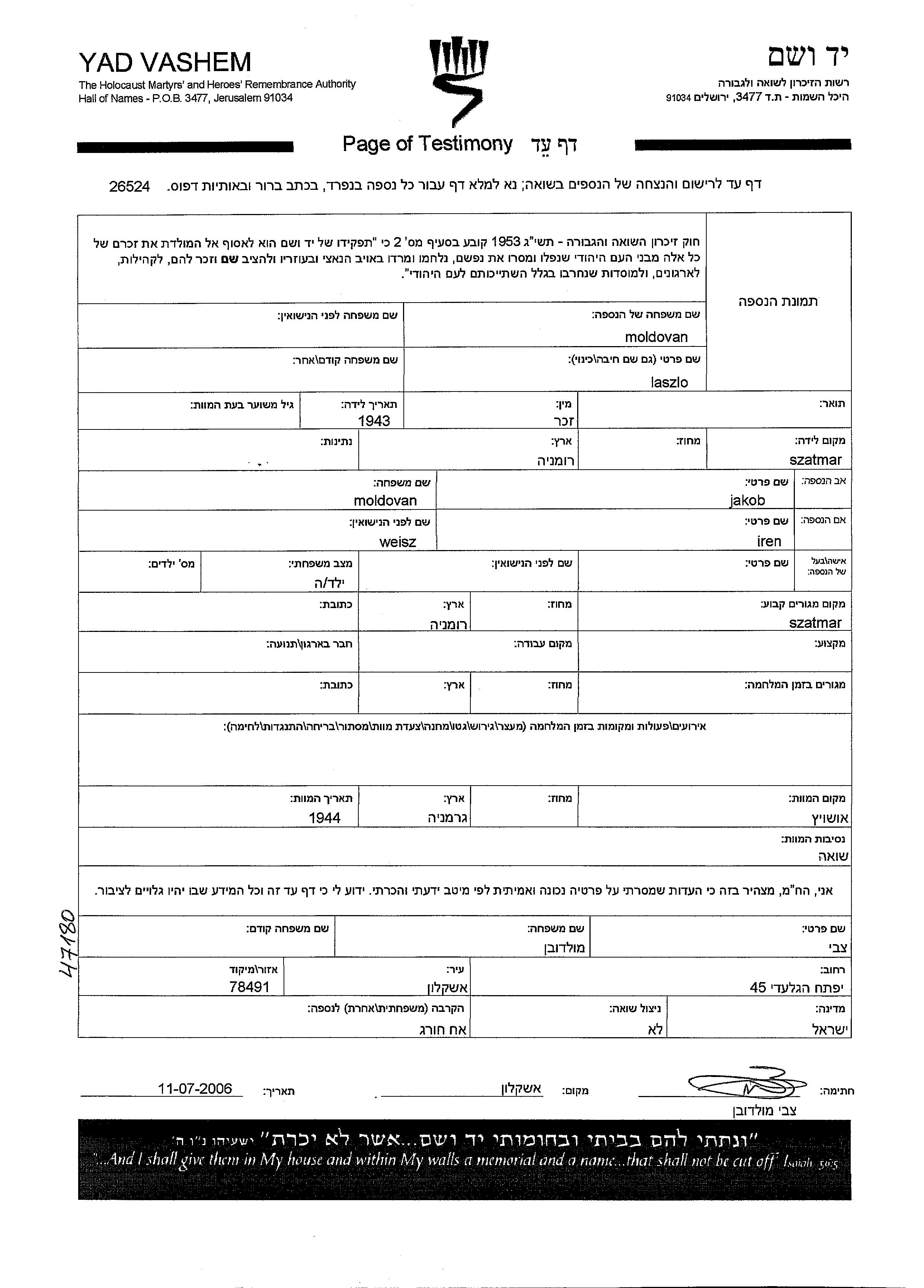 Laszlo Moldovan wurde im Jahr 1943 in Szatmar, Rumänien geboren. Er war der Sohn von Jakob und Iren, geb. Weisz. Er war Kind. Vor dem Zweiten Weltkrieg lebte er in Szatmar, Rumänien.