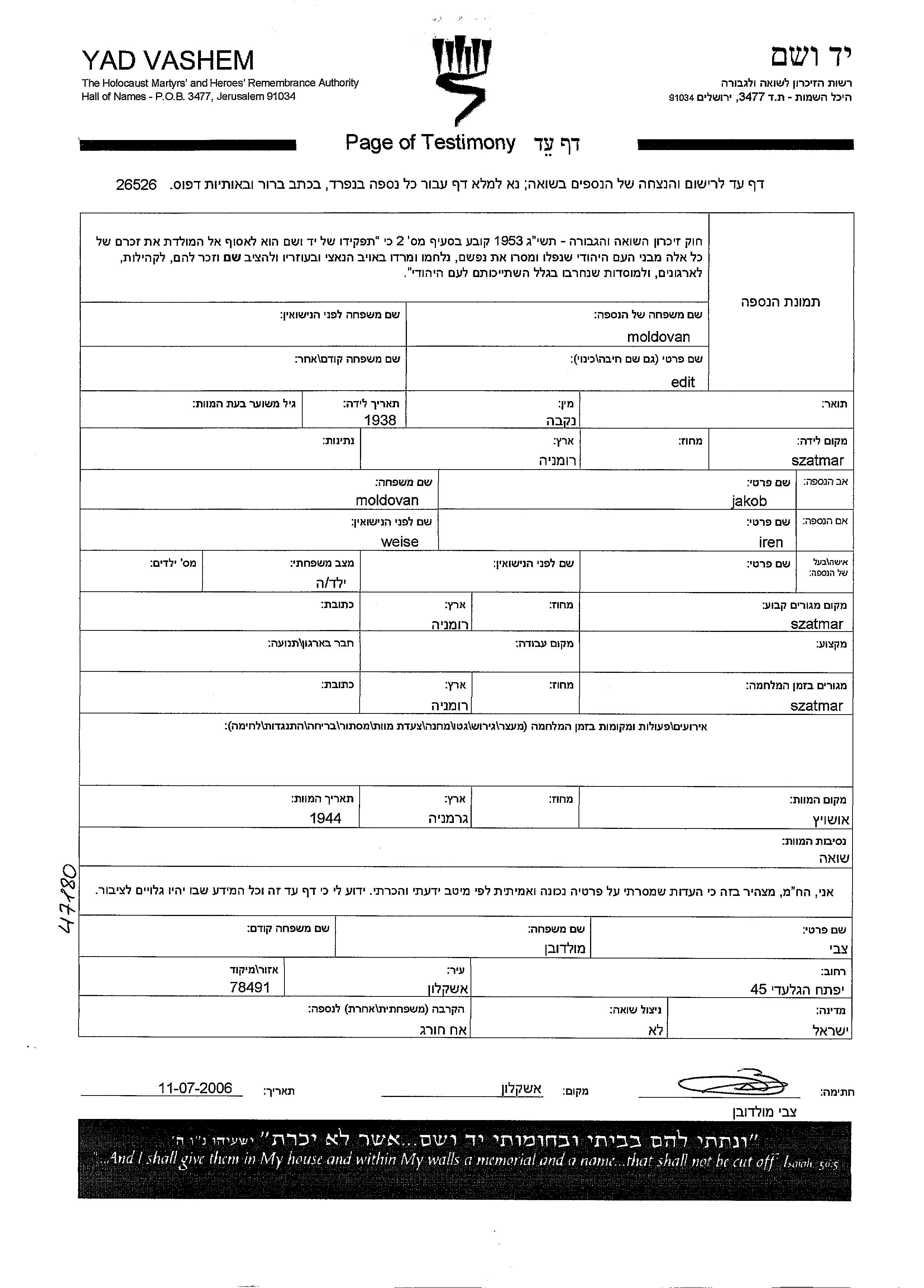 Edit Moldovan wurde im Jahr 1938 in Szatmar, Rumänien geboren. Sie war die Tochter von Jakob und Iren, geb. Weise. Sie war Kind. Vor dem Zweiten Weltkrieg lebte sie in Szatmar, Rumänien. Während des Krieges war sie in Szatmar, Rumänien.