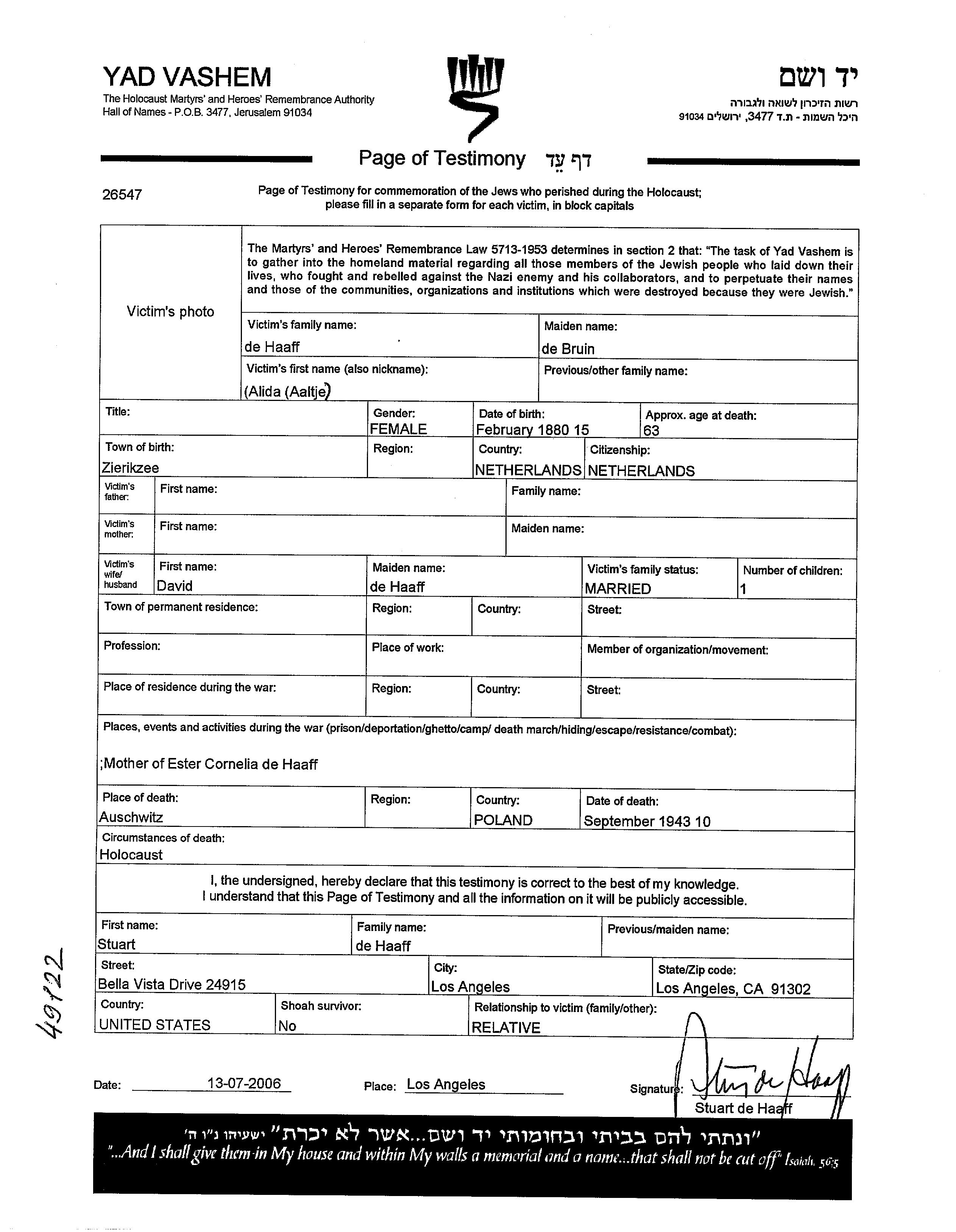 Aaltje Alida wurde in der Schoah ermordet. Todesort: Auschwitz, Polen im Jahr 10/09/1943.