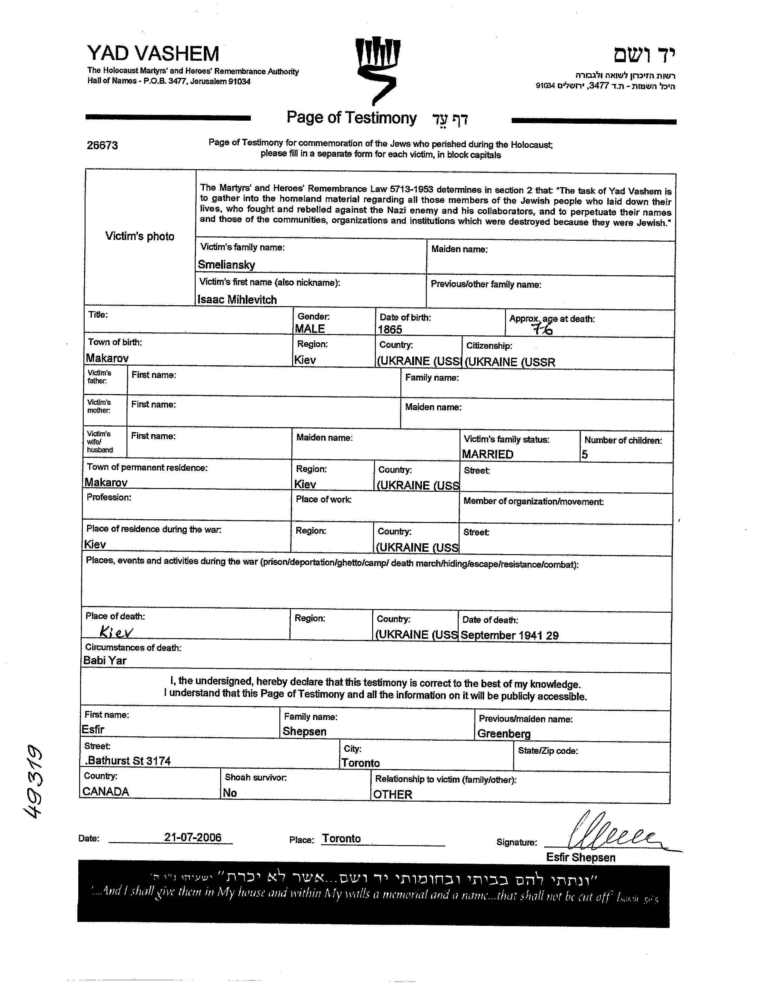 Isaac Smeliansky wurde im Jahr 1865 in Makarov, Ukraine (UdSSR) geboren. Er war der Sohn von Mikhl. Er war Verheiratet. Vor dem Zweiten Weltkrieg lebte er in Makarov, Ukraine (UdSSR). Während des Krieges war er in Kiev, Ukraine (UdSSR).