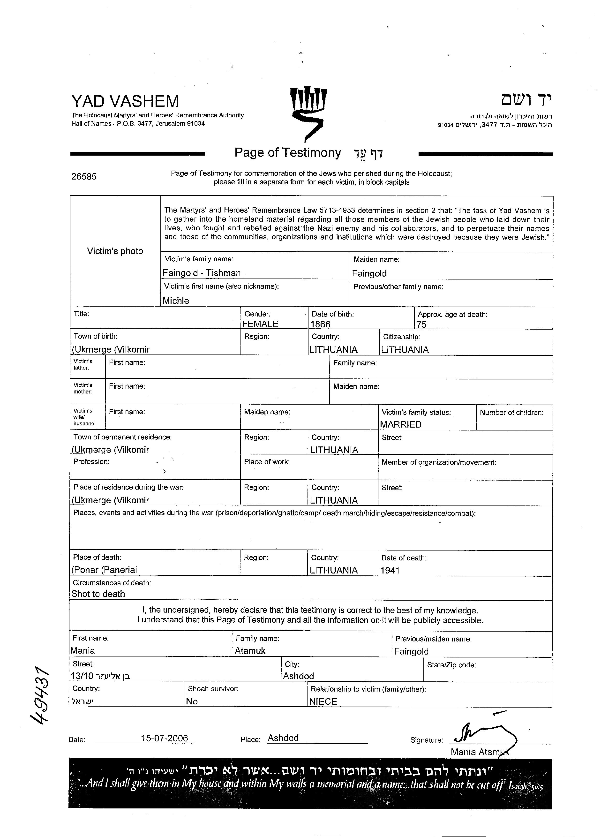 Michle Tishman, geb. Faingold wurde im Jahr 1866 in Ukmerge, Litauen geboren. Sie war Verheiratet. Vor dem Zweiten Weltkrieg lebte sie in Ukmerge, Litauen. Während des Krieges war sie in Ukmerge, Litauen.