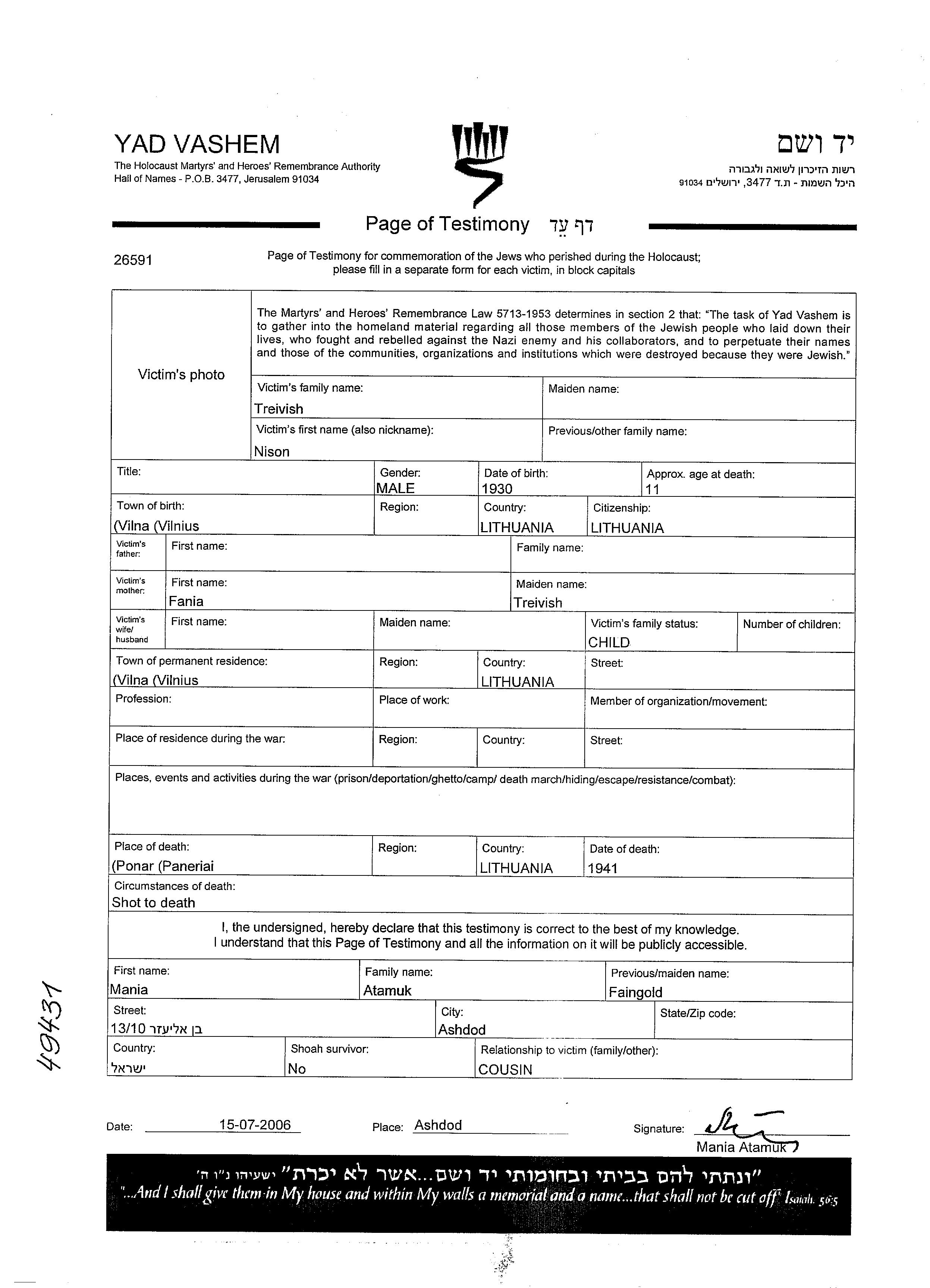 Nison wurde in der Schoah ermordet. Todesort: Ponary Area, Polen im Jahr 1941.