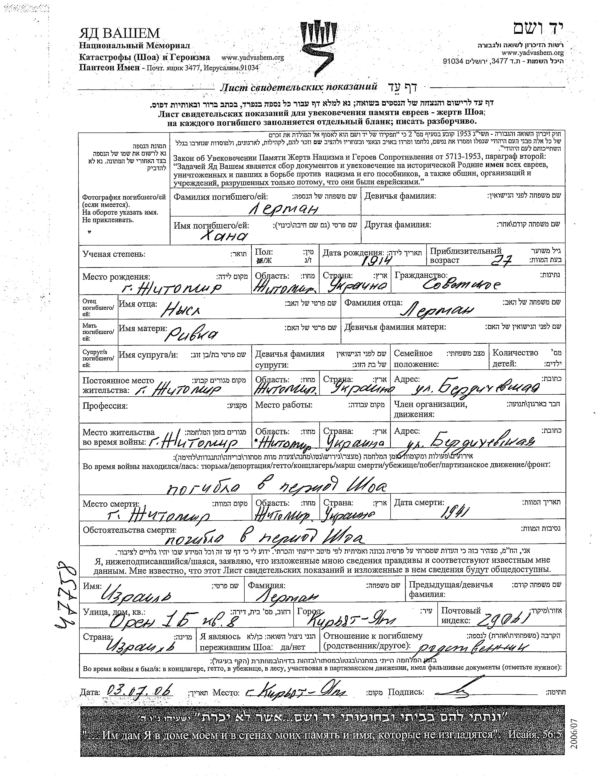 Khana Lerman wurde im Jahr 1914 in Zhitomir, Ukraine (UdSSR) geboren. Sie war die Tochter von Nysl und Rivka. Sie war Ledig. Vor dem Zweiten Weltkrieg lebte sie in Zhitomir, Ukraine (UdSSR). Während des Krieges war sie in Zhitomir, Ukraine (UdSSR).